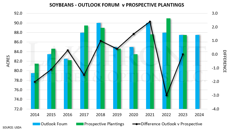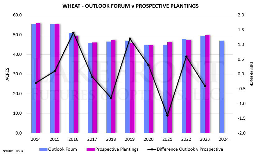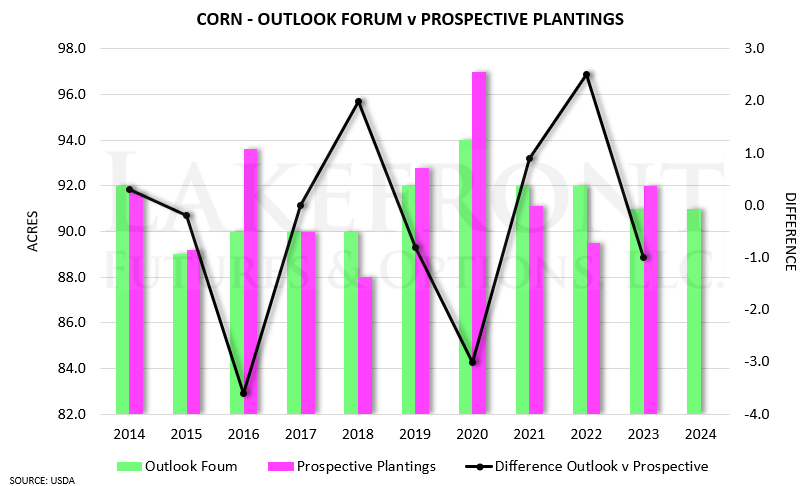 For corn, the prospective plantings acres have came in higher than the USDA outlook forum the past 7 of 11 years.