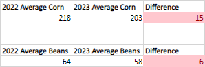 He also had 20 bean growers report. 5 in Iowa, 2 in Illinois, 5 in Indiana, 5 in Nebraska, 2 in South Dakota, and 1 in Ohio. Their average yield came in at 58 bpa vs last year's 64. A -6 bushel decrease.