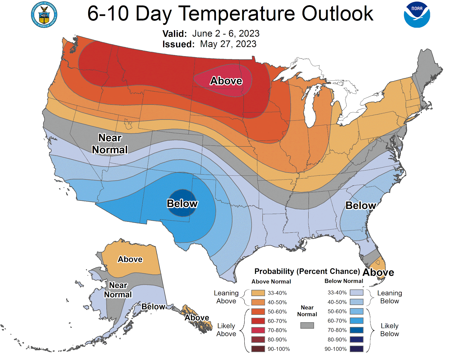 Here are a couple of maps that show a possible trend change. The first is the 6-10 day temperature outlook. This itself is rather bullish, but when you add in the second map, you notice that the heat has moved and the coolness has expanded.