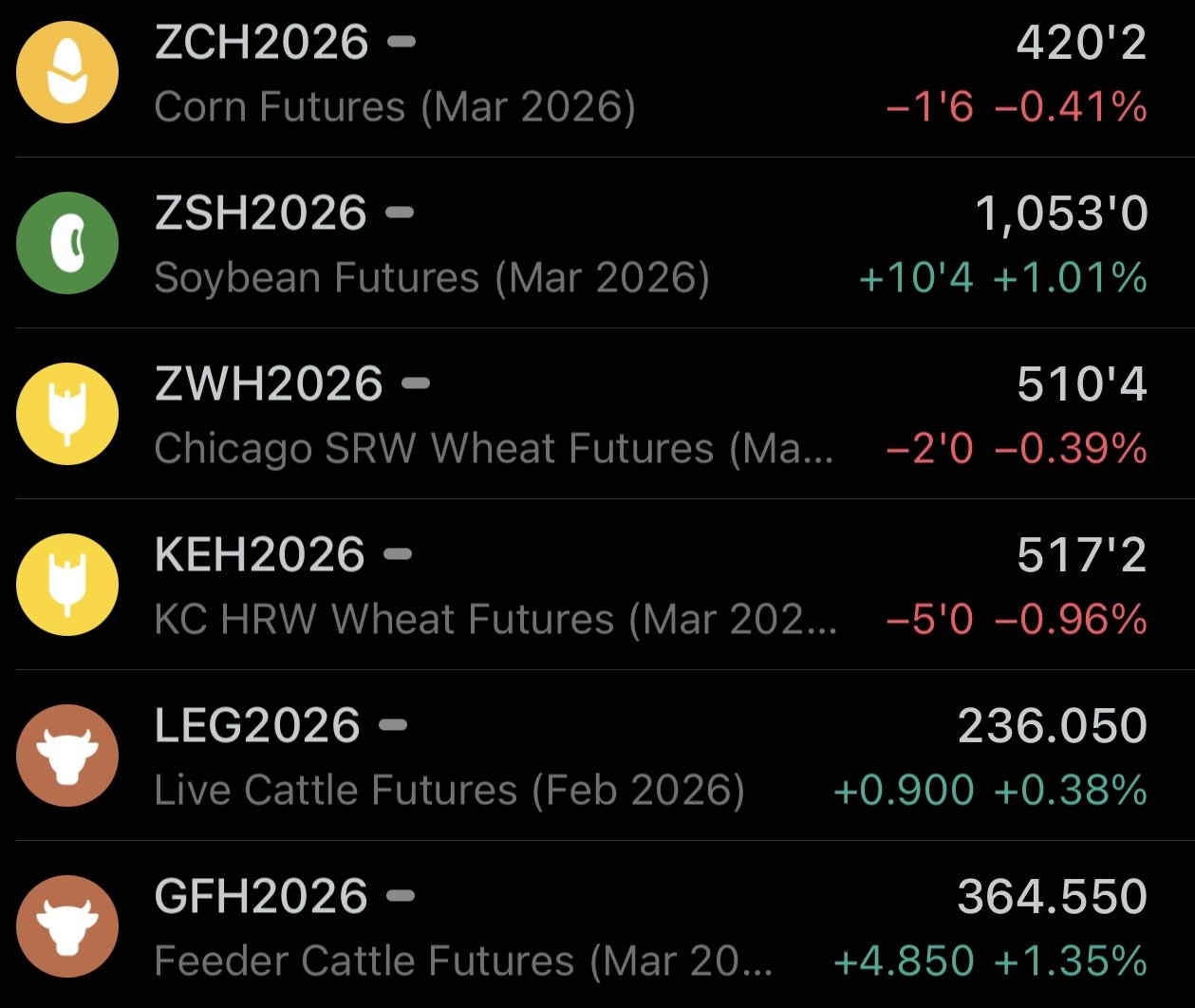 Grains mixed with soybeans leading the way higher, while the cattle market continues to push along higher.