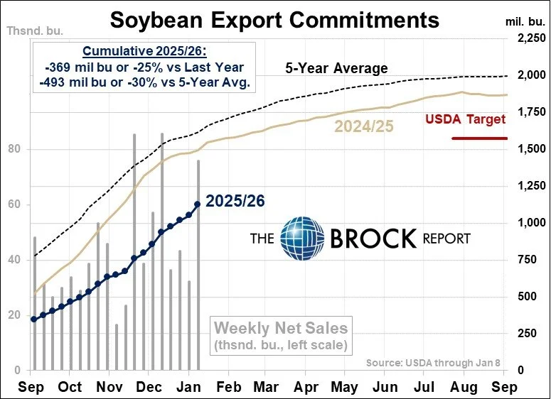 Soybean exports are still down -25% or -370 million bushels behind last year.
