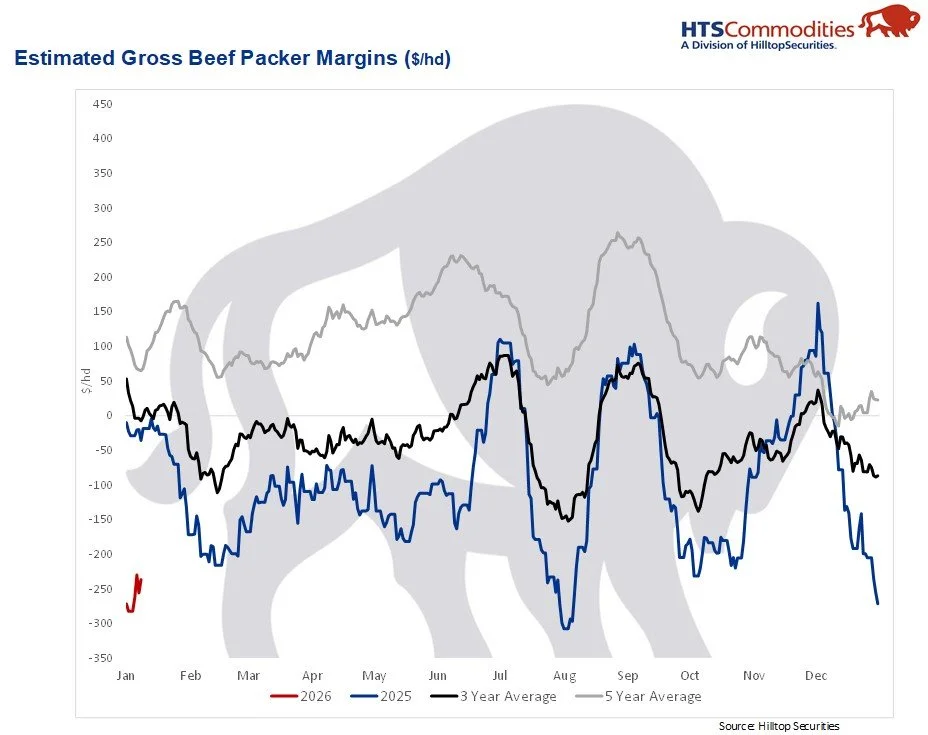 Below is a chart from HTS Commodities that shows estimated gross beef packer margins.