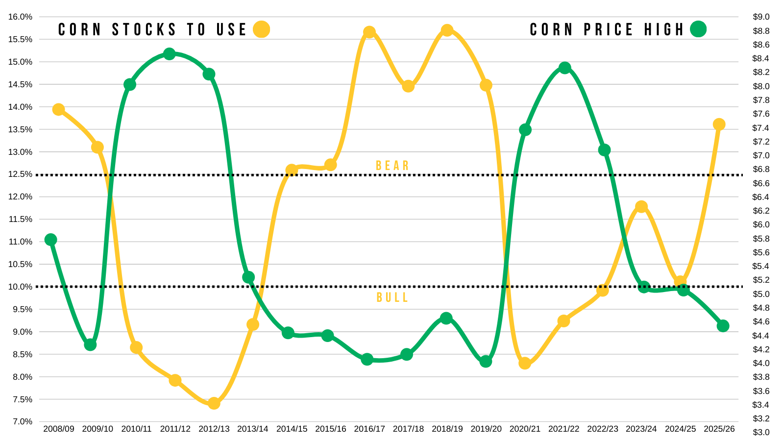 But this shows our stocks to use (yellow) along with corn's highest price of the year (green).