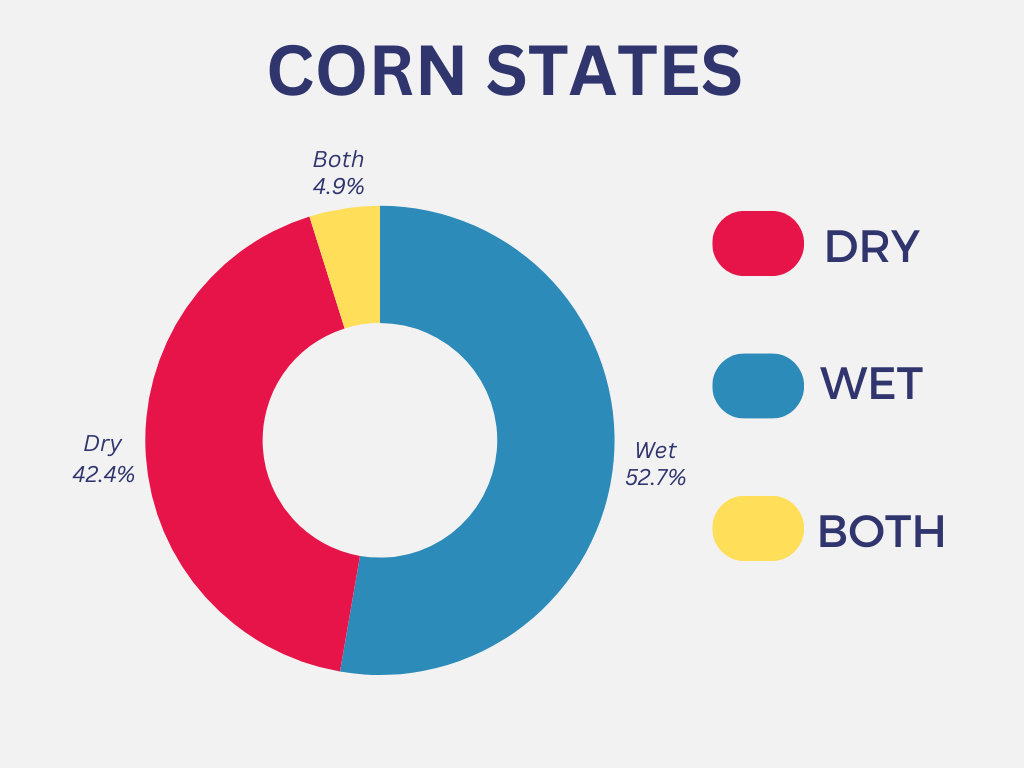 Nearly 53% of corn production is wet, where as 42% is dry.