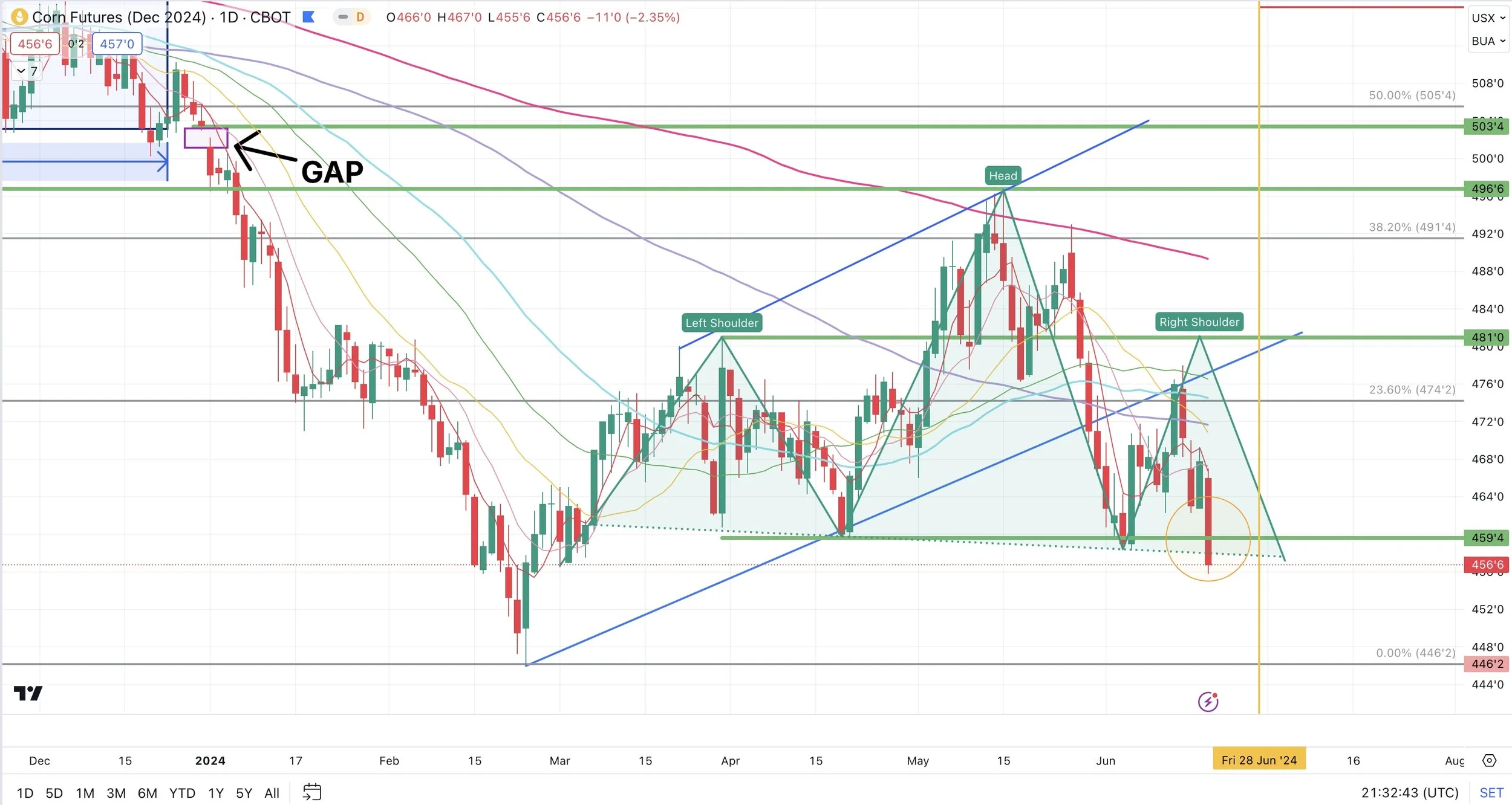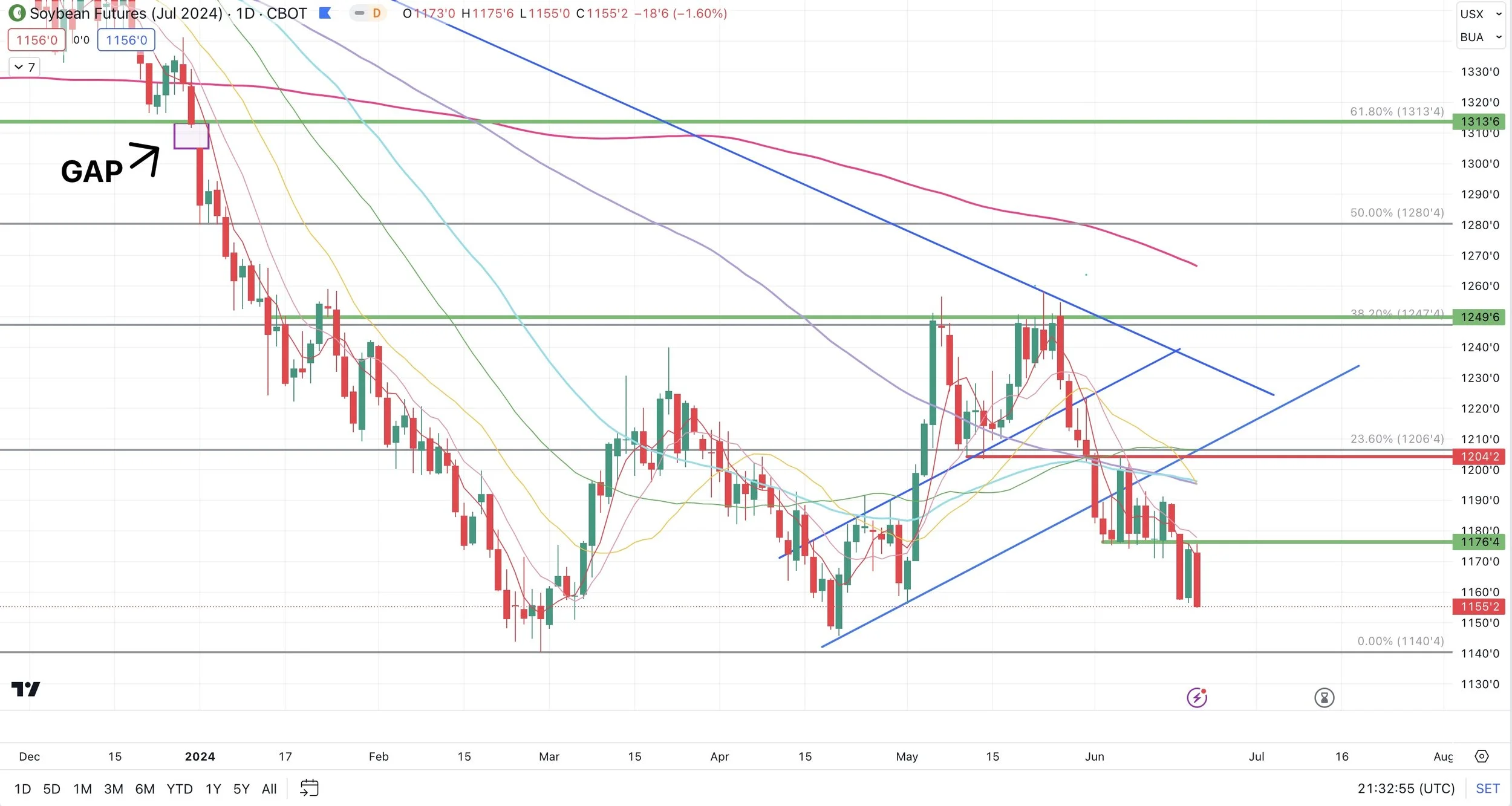 Grains absolutely destroyed today. Down double digits across the board, trading to our lowest levels since April for most of the grains. Taking out some technical support along the way.