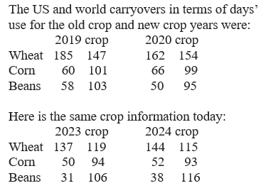Severe drought in Mexico, Spain, and 2 of 3 safrinha corn state in Brazil have serious drought, 40% of Chinas corn is in drought, as well as the eastern corn belt with many others being too wet. Ukraine & Russia have been dry months. US corn export pace has been increasing since November. Feed use is always low balled by USDA. Argy's corn crop has already been reduced 15-20% due to too much rain and disease. Interior Brazil corn prices are higher than the ports, so presently no corn exports from Brazil. Last year's high for Dec corn was $6.29 with a projected carryout of 2.257 billion bushels (which is a 57 day supply) on June 21st. This year's carryout projection is 2.102 billion (52 day supply). World carryout last June was a 95 day supply, this year it is 93. The US has never yielded more than 177.4 bpa. The USDA is using 181 on the S&D for the 2024 crop. That is not going to happen. Bullish. (Indicates don’t sell)