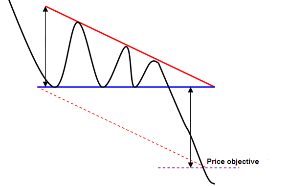 This pattern is called a descending triangle. The implied move to the downside is equal to the same move we saw to the upside, from the bottom to the top of the triangle.