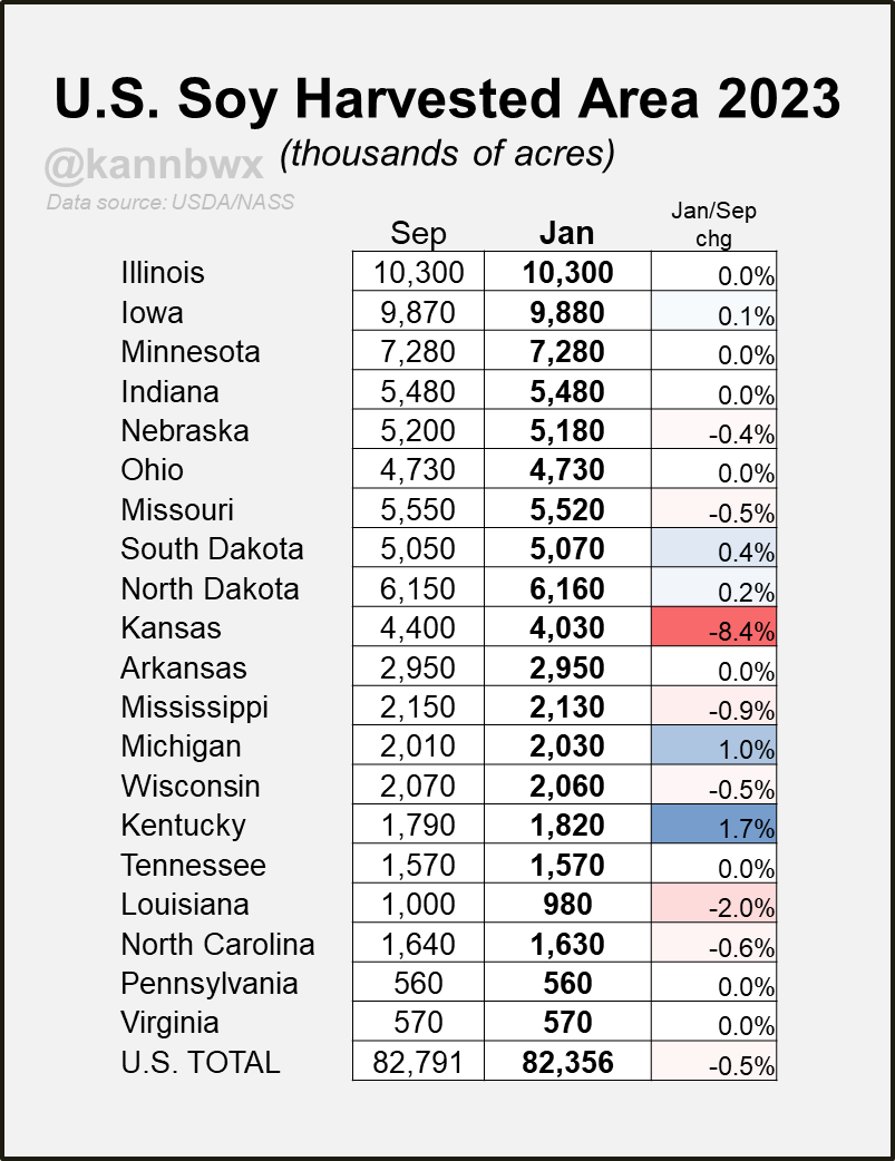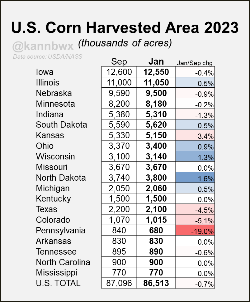Here is the harvested acres, not any major changes to the top producing states. Again, it was beneficial that these harvested acres came in low.