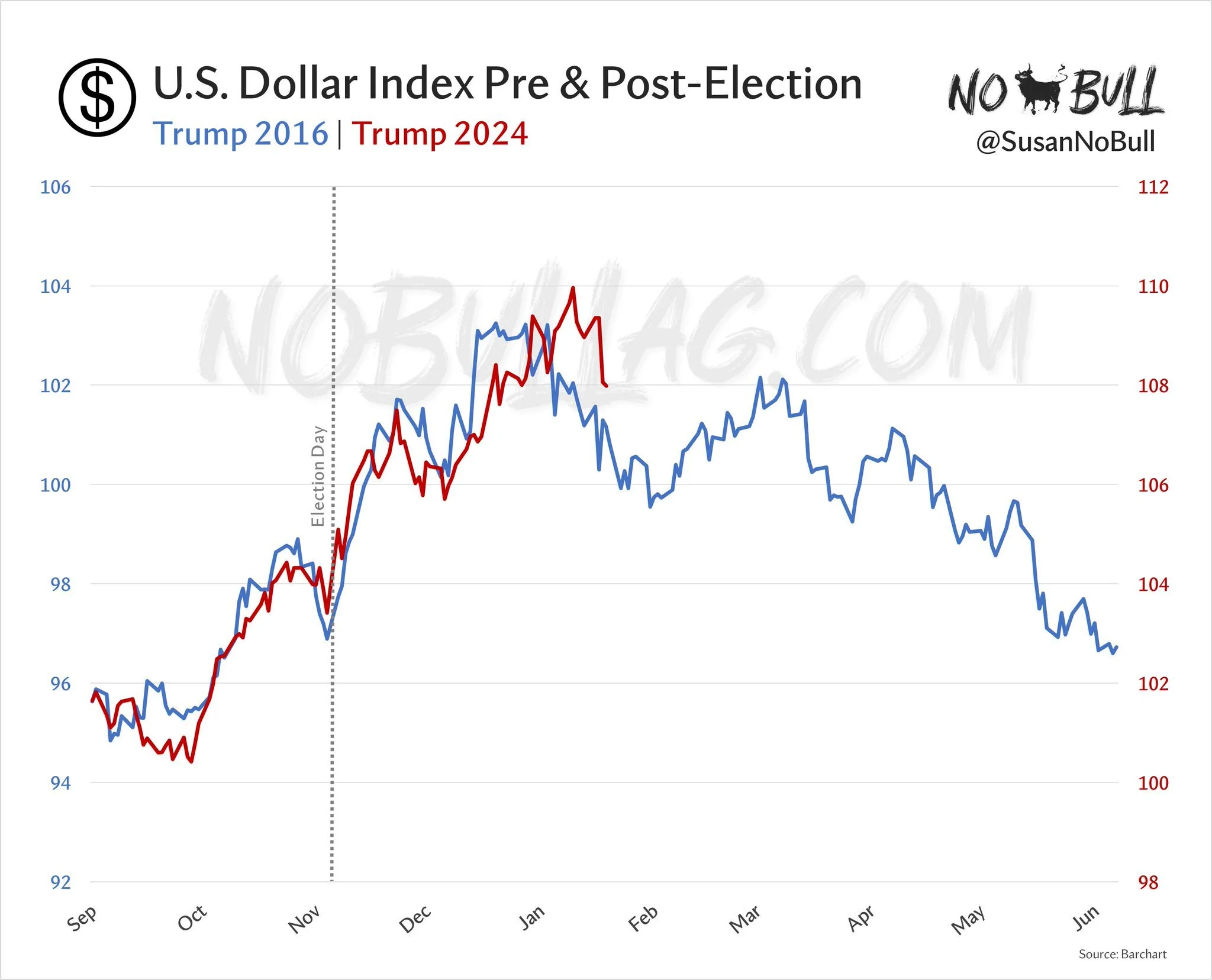 Here is a good seasonal comparison of the dollar from NoBULL Ag. It compared this years dollar to the last time Trump entered office. I also think the dollar likely starts to fall.