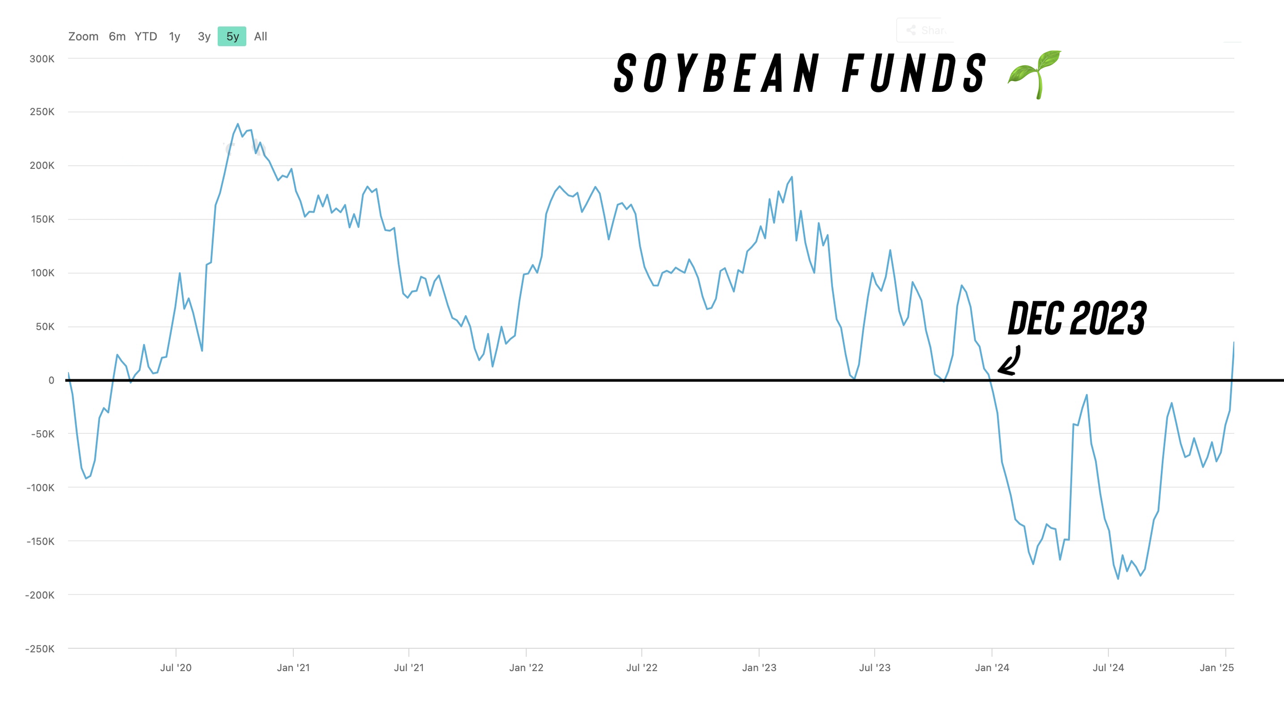 The funds are now actually long soybeans despite all of the bearish tailwinds.