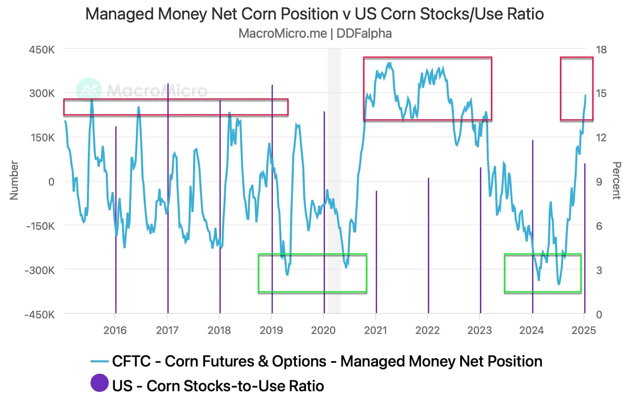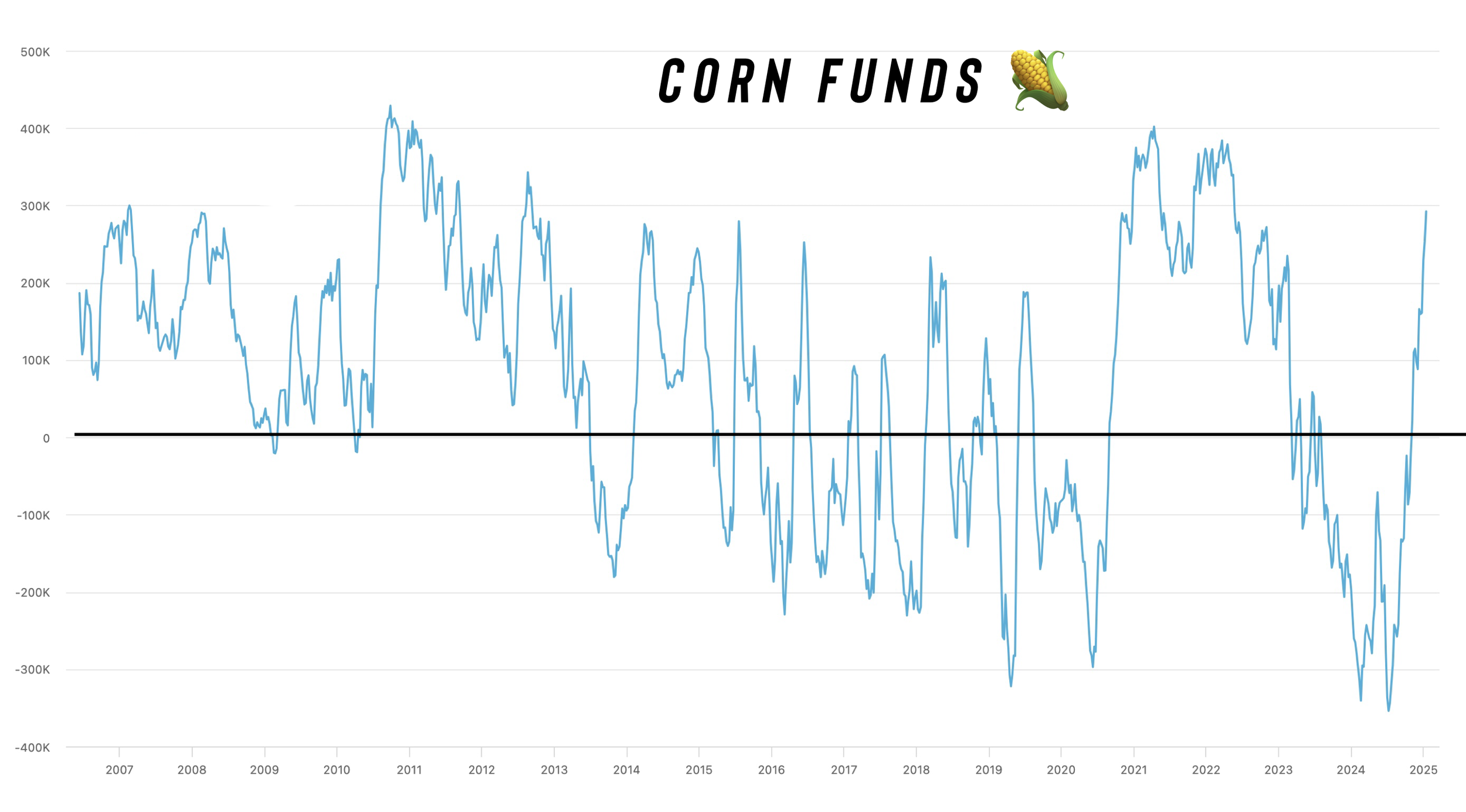The funds are long nearly 300k contracts of corn. They have not been that long since 2022..
