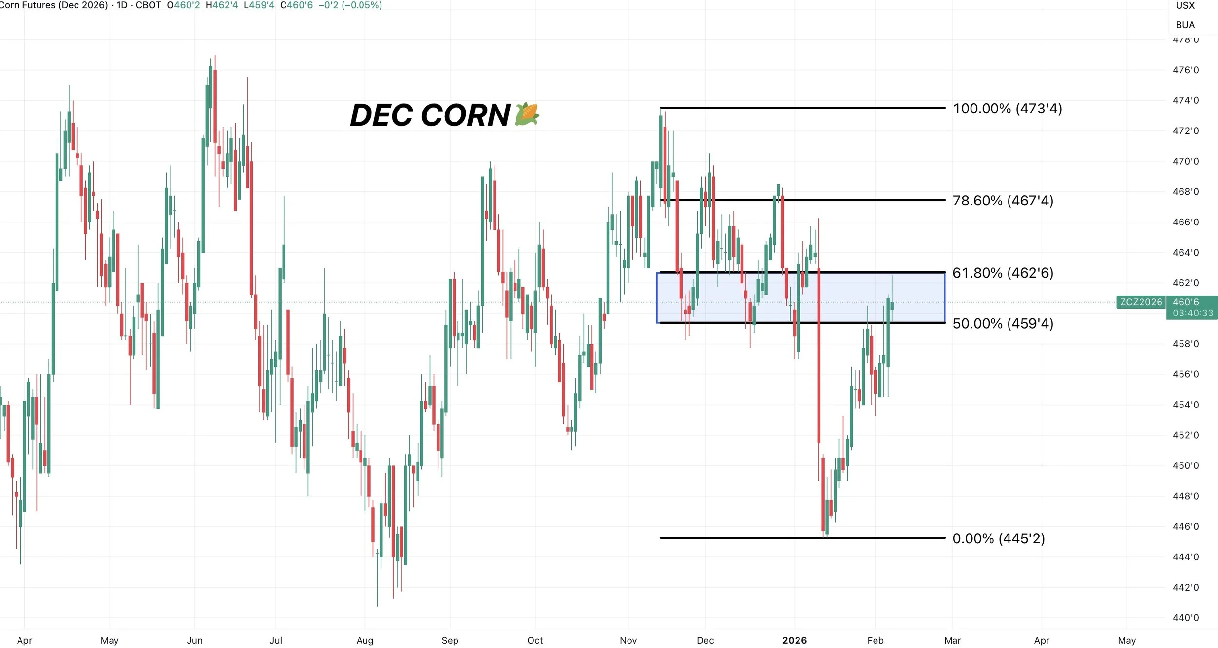 Dec corn clawed back exactly 61.8% of the entire sell off. The most common level. It’s also prior support. Struggling here would not be a surprise.