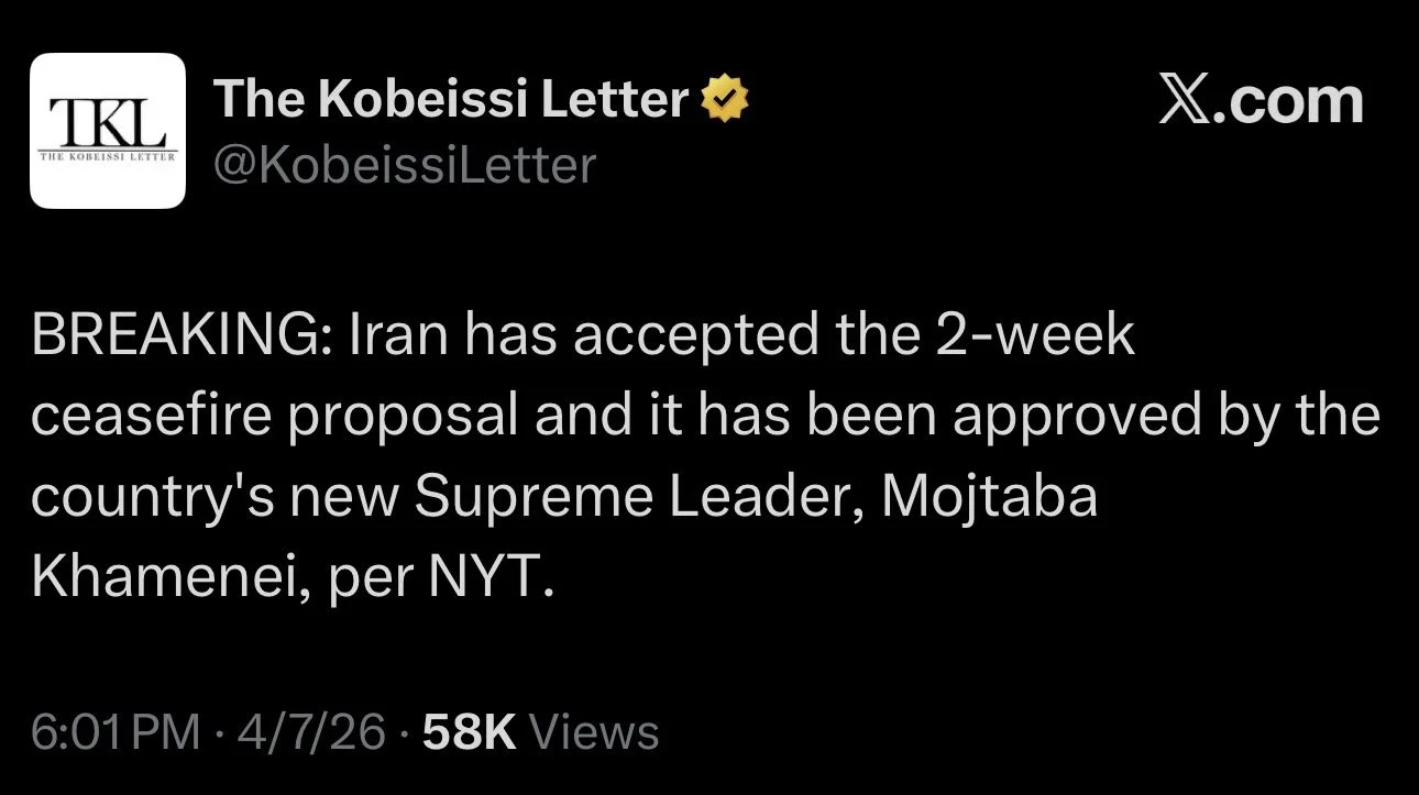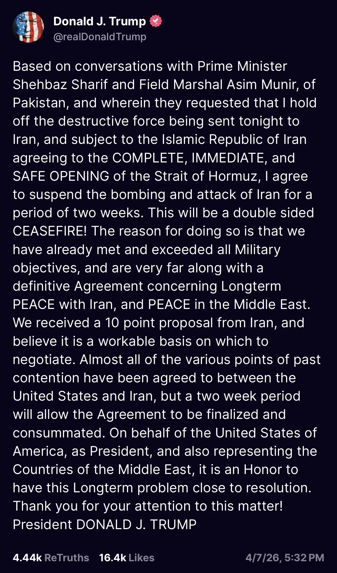 Then at 5:30pm CT tonight, Trump sent a 2-week ceasefire proposal to Iran.
