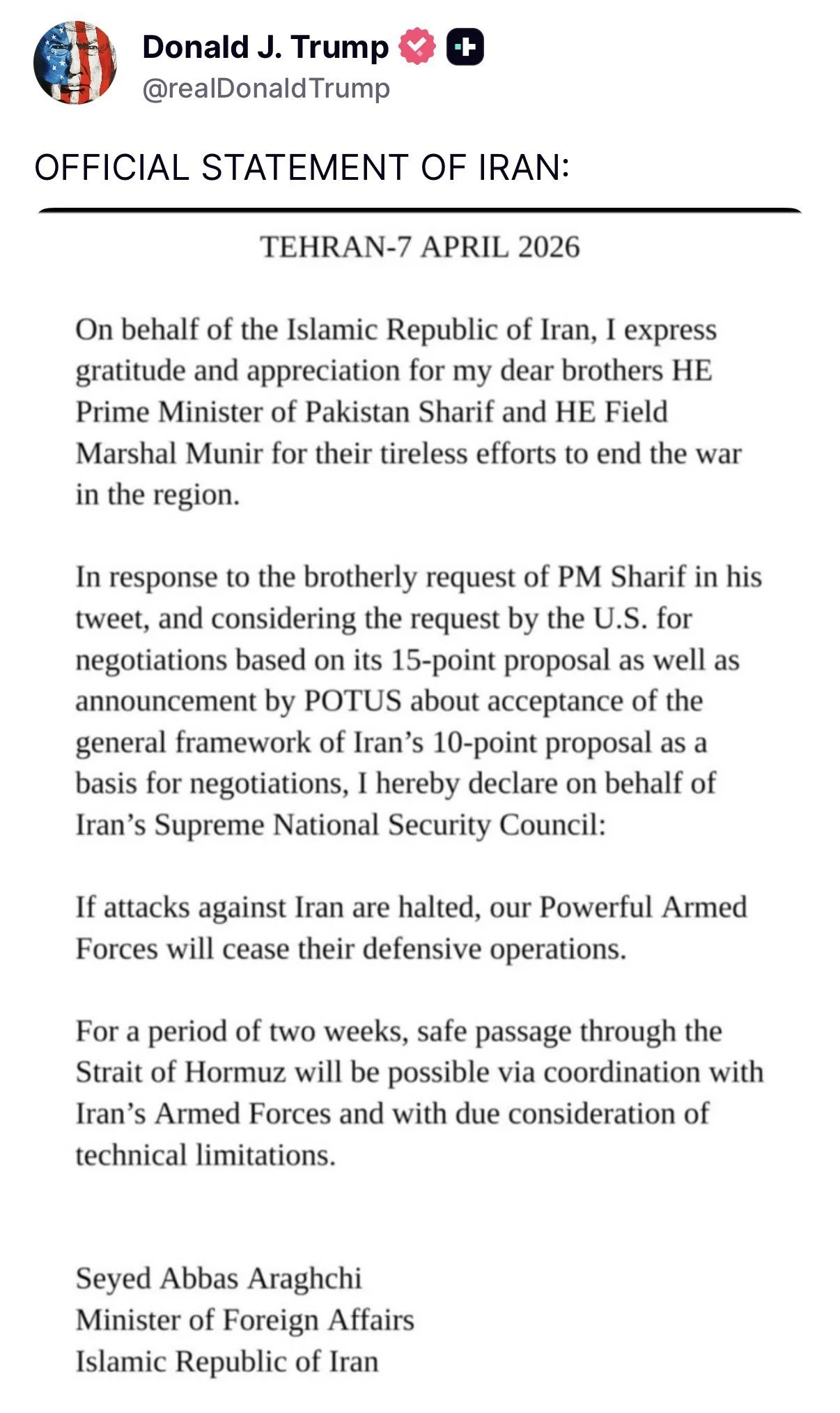 Here is the offical statement from Iran. They’ve agreed to re-open the strait.