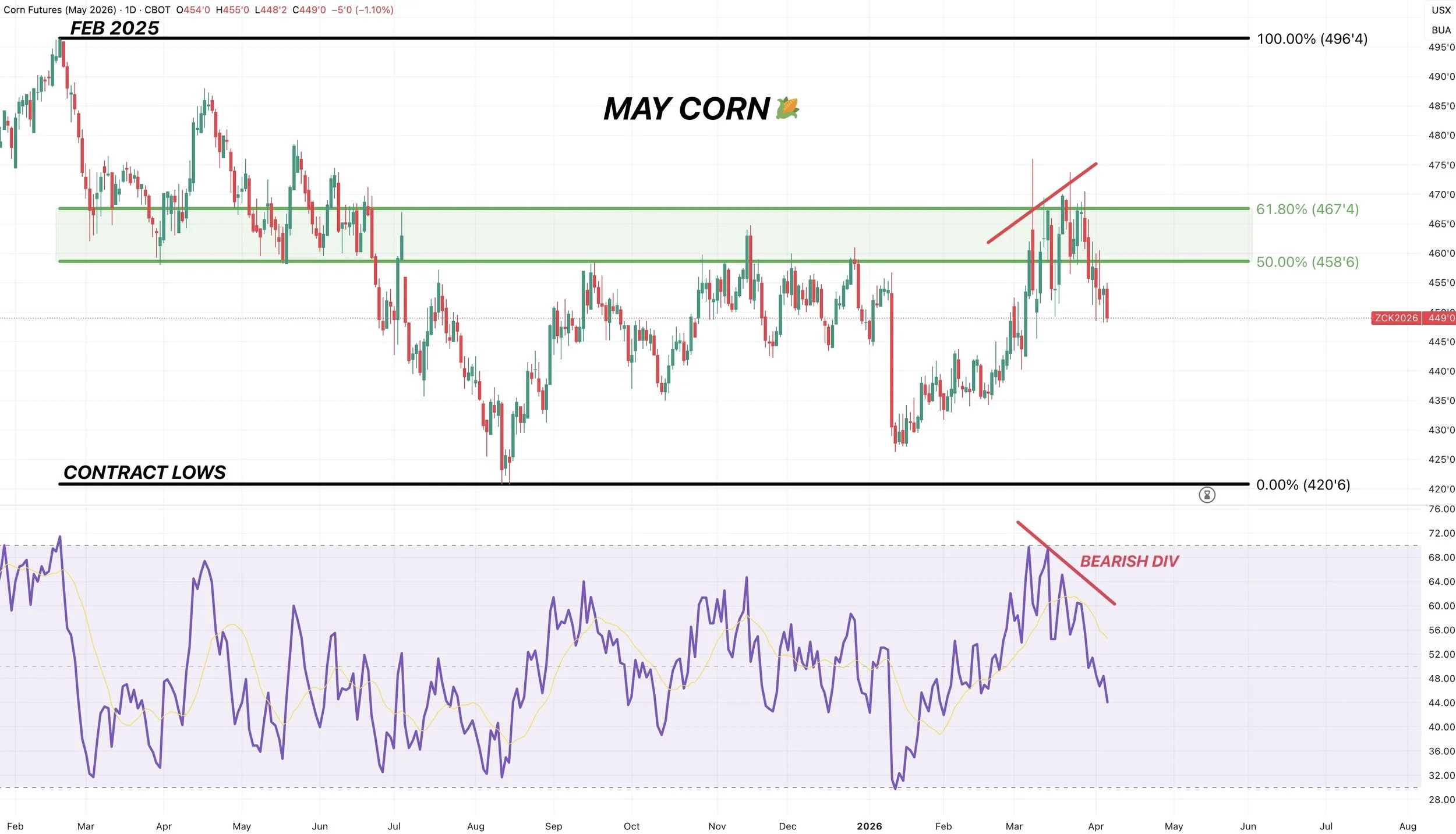 The last few weeks I talked about wanting to reward or defend those levels, as we had some clear bearish divergence on the RSI across all corn contracts that was hinting we were starting to lose upside momentum.