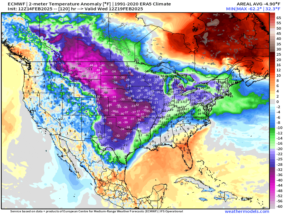 Very cold in the plains with temps nearly -40 degrees colder than normal.