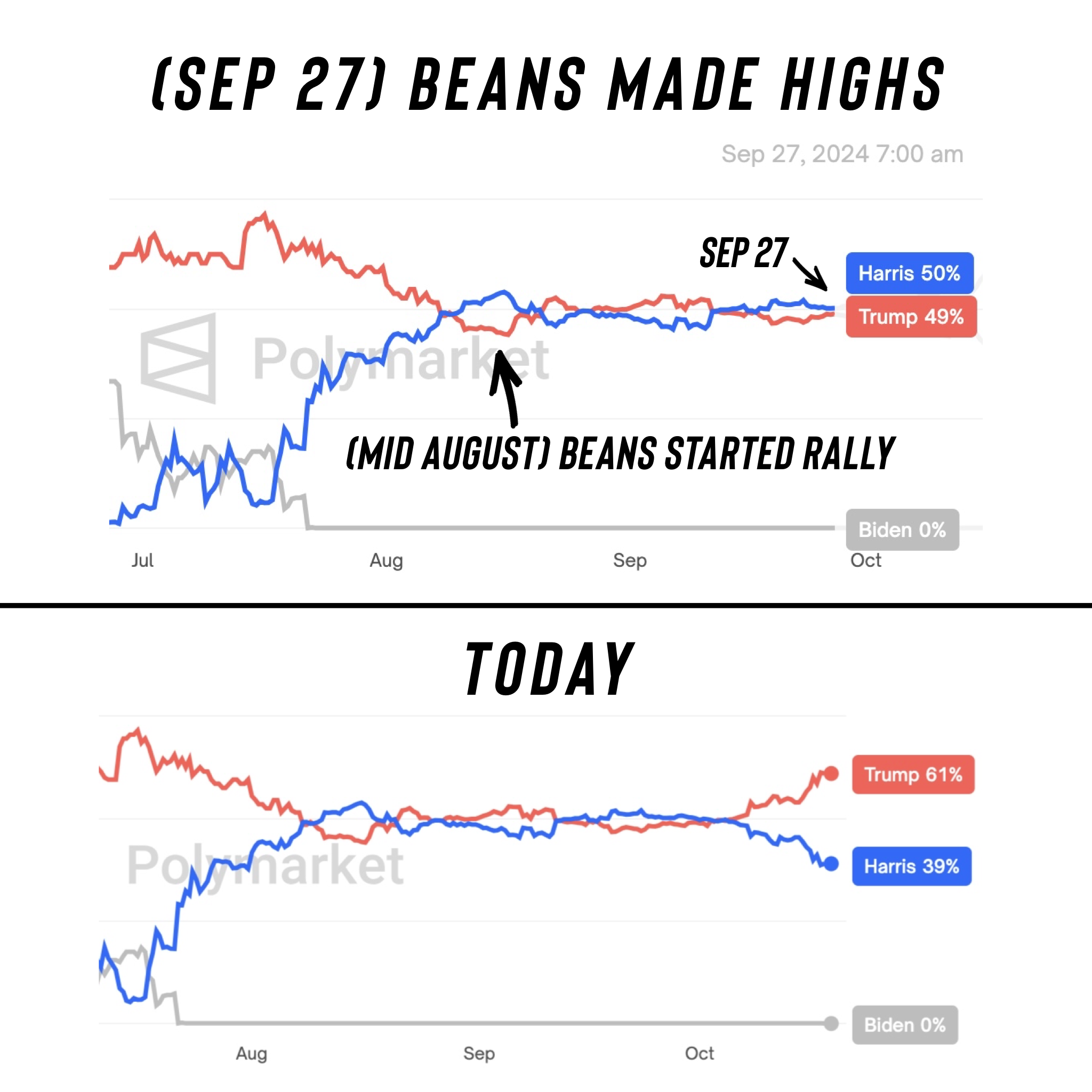 If you take a look at the polls, beans did start falling right when Trump started pulling away. They also began their initial mid-August rally right when Harris took the lead.
