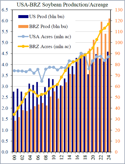 Here is a chart from StoneX that shows the historical acres & production for both Brazil and the US.