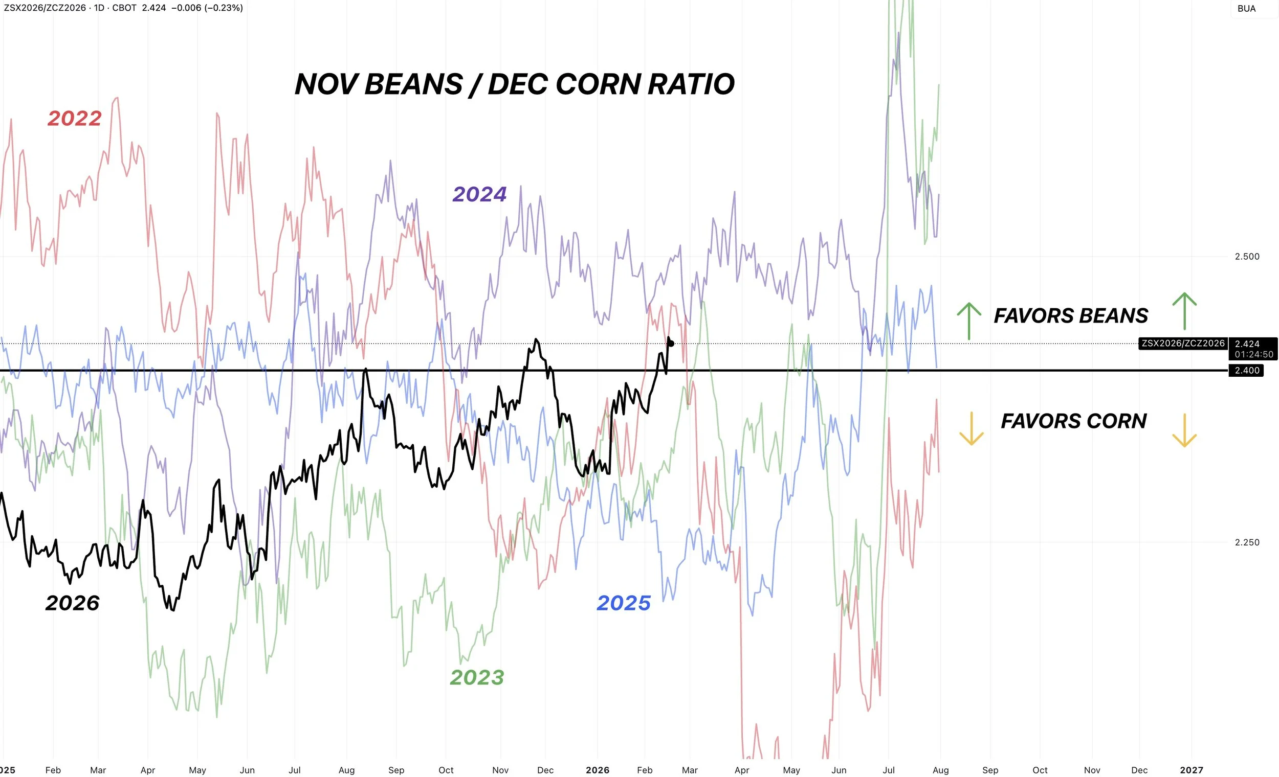 It's sitting at 2.43 today. Posting a new high but still isn’t "heavily" favoring a massive amount of corn switching to beans.