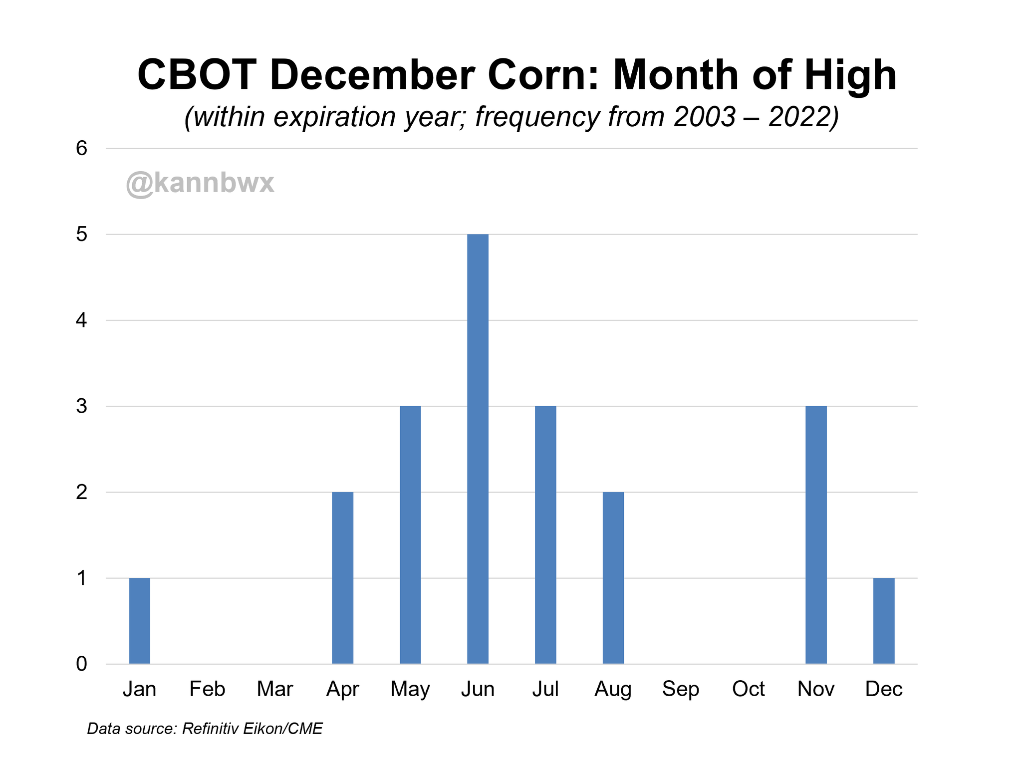 Below is a 20 year graph showing when new crop corn has made it’s highs. We believe this will be year 14 when we make our highs in May-June-July-August.