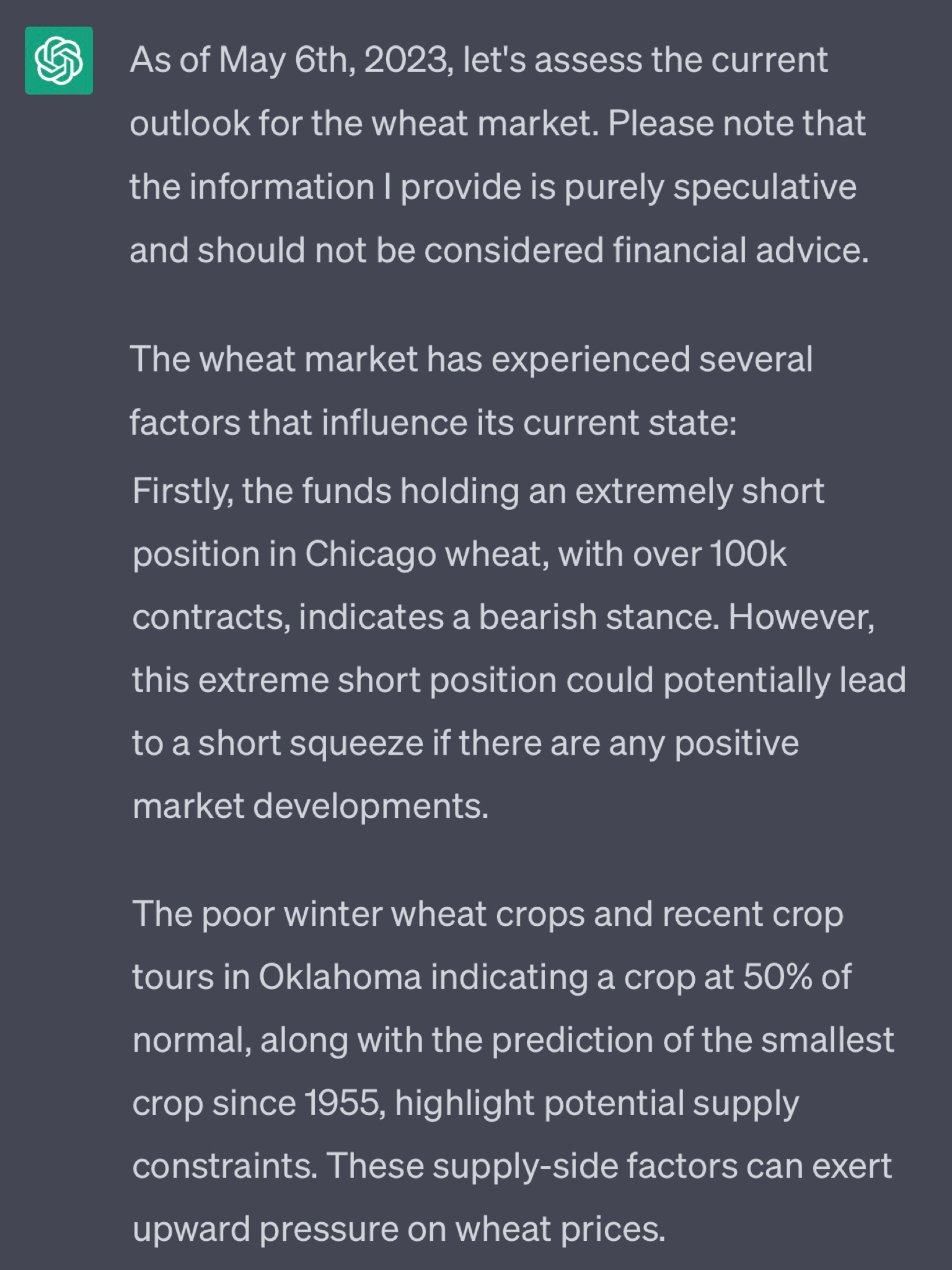 Yesterday we asked the popular AI tool ChatGPT it’s opinion on the wheat market. 🌾
