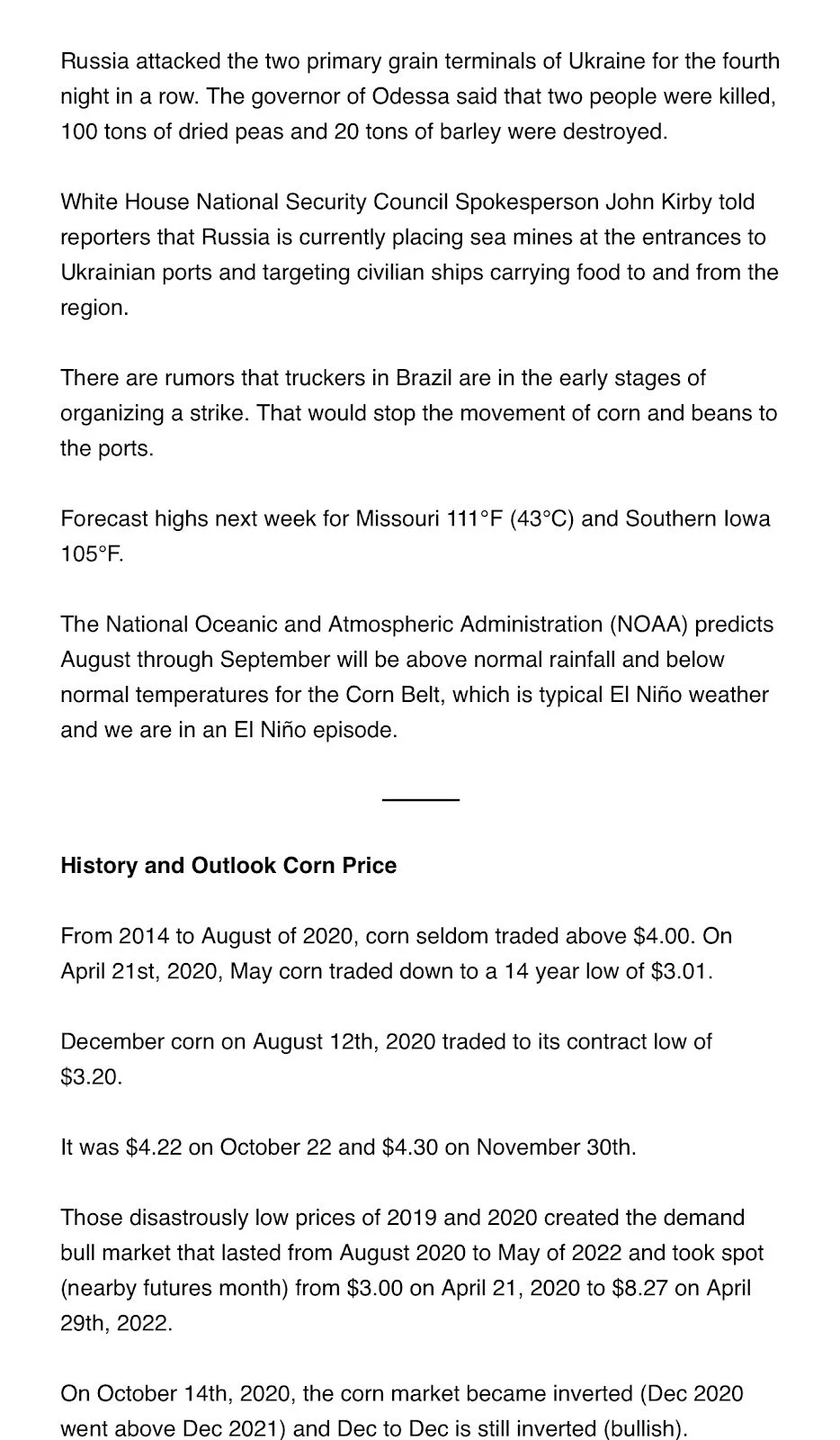 If soybean yield comes in below 50 bushels per acre in the August, September or October USDA crop reports look for soybeans to make new all time highs on a weather scare for the South America crop in late 2023 into early 2024.