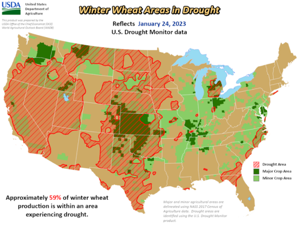 Drought continues to be a major issue for U.S. winter wheat production with 59% of production areas estimated to be in regions experiencing drought. Winter wheat condition in top grower Kansas is 21% G-E, identical to late November but up +2% from the start of January. Texas G-E totals 14%, up from 11% a week earlier, but down from 21% from two months ago.