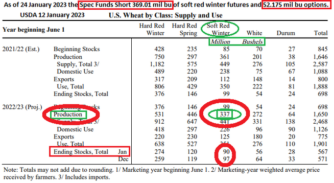 Spec funds are net short 73,802 contracts of CBOT wheat, which is soft red winter wheat. Those funds have an obligation to buy 369 million bushels of SRW wheat or wheat futures, which is more than the U.S. produced in 2022 and nine times more than the carryover projected for May 31st, 2023. Do not be short soft red winter wheat. It is very difficult not to be super bullish CBOT wheat with such stupidity in play.
