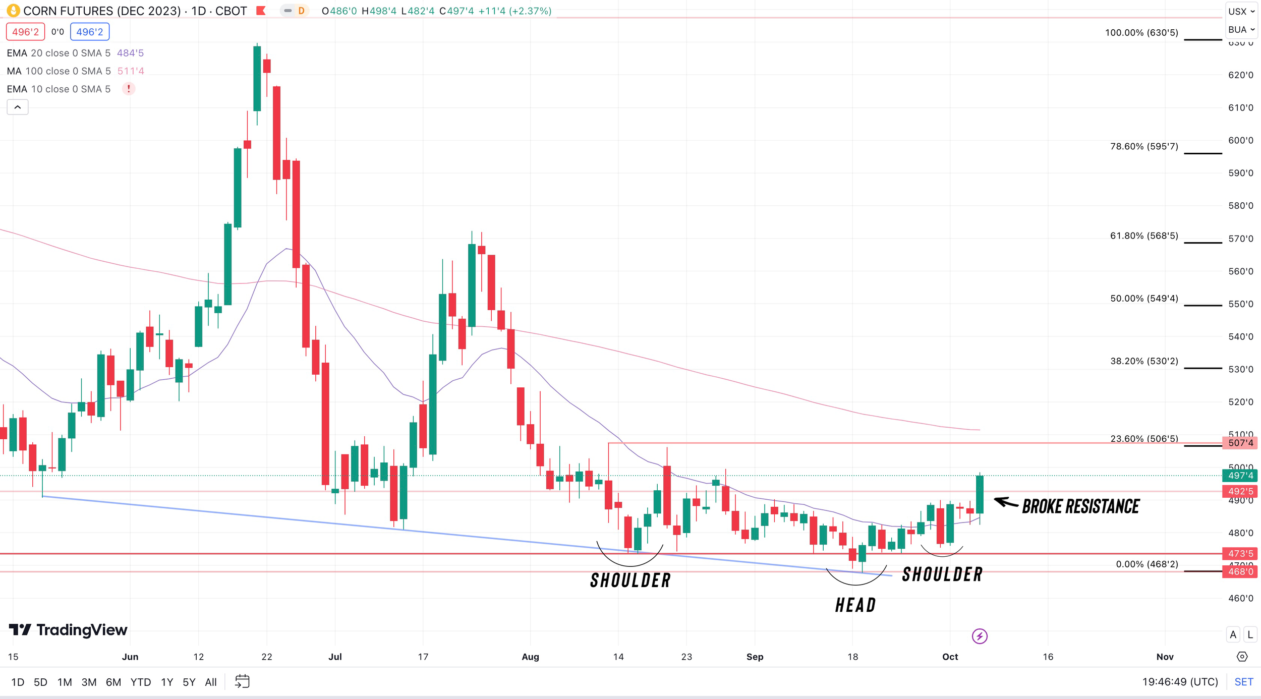 We took out all of September’s highs. Corn hadn’t closed above $4.90 since August 28th. Corn hasn’t closed above $5.00 since August 1st. Today we closed at $4.97 1/2.