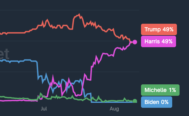 Betting websites have the election odds at 50/50. Kamala actually somehow took a slight lead today according to the betting polls.
