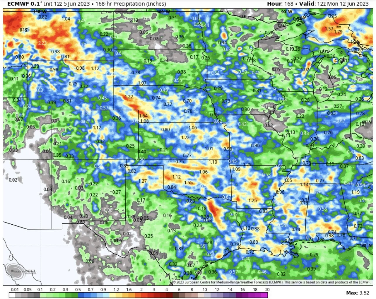 The Euro model below went drier over the next 7 days. Taking out the heavy rain chances and increasing temps for good portion of corn belt. Shocker.