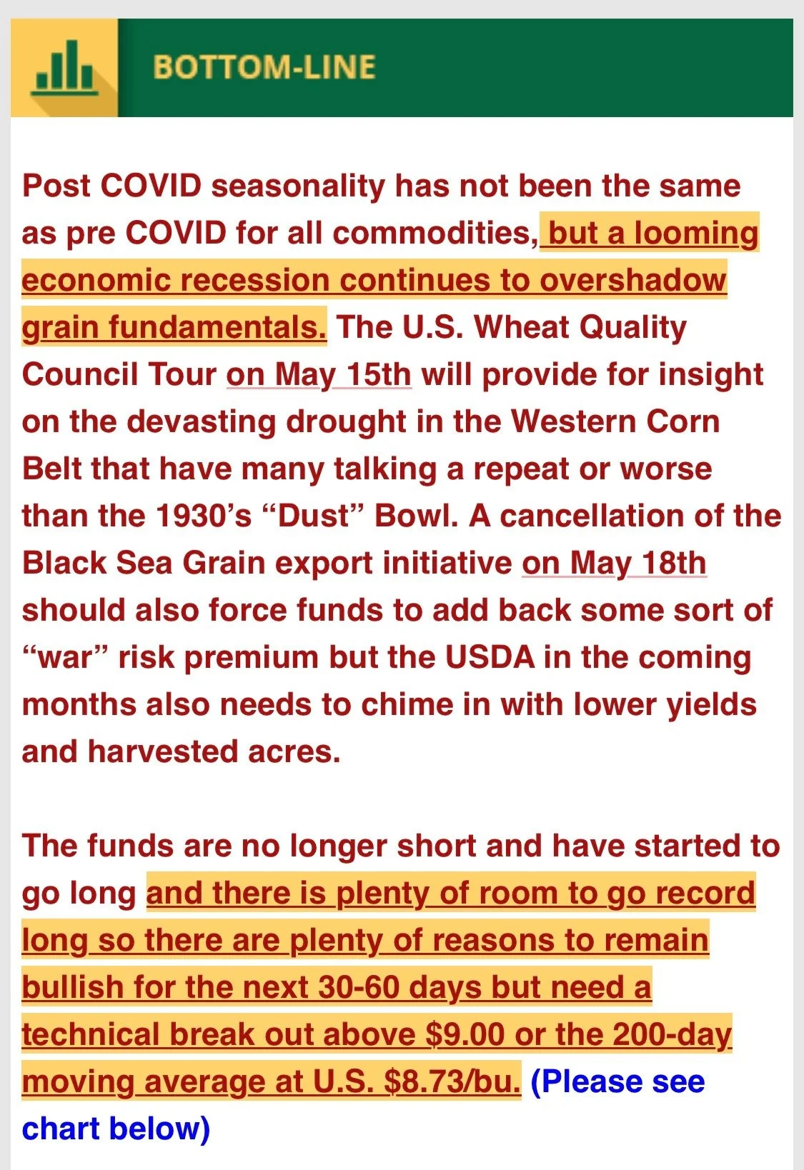 Now the more farmers become price makers instead of price takers the higher the bounce can and should be. The bottom line is many farmers have bin doors shut and likely will be shut until we hit 7.00 plus futures or see a crop being made, which we won’t know until sometime in July-August.