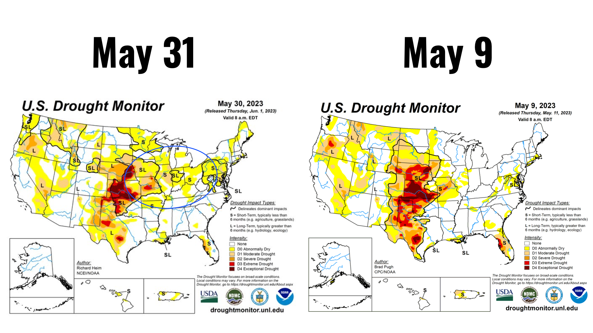 Below is a drought monitor comparing the most recent one, with one from 3 weeks ago. As you can see, we are seeing some slight improvements in areas such as Oklahoma, but the dryness is spreading east into the corn belt.