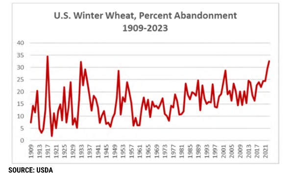 Based on preliminary statistics provided by USDA/NASS, U.S. winter wheat abandonment for 2023 is pegged at 32.6%. If realized, this would be the nation’s highest winter wheat abandonment rate since 1917. But we would know this only after harvest, by Sept. In fact, since abandonment reached 28.6% in 1951, the only years more than one-quarter of the winter wheat was abandoned were 2002, with 28.8%, and 2022, with 29.5%. According to initial 2023 expectations, Texas will lead the U.S. with 70% winter wheat abandonment, followed by Oklahoma at 53%. (Please see chart below)