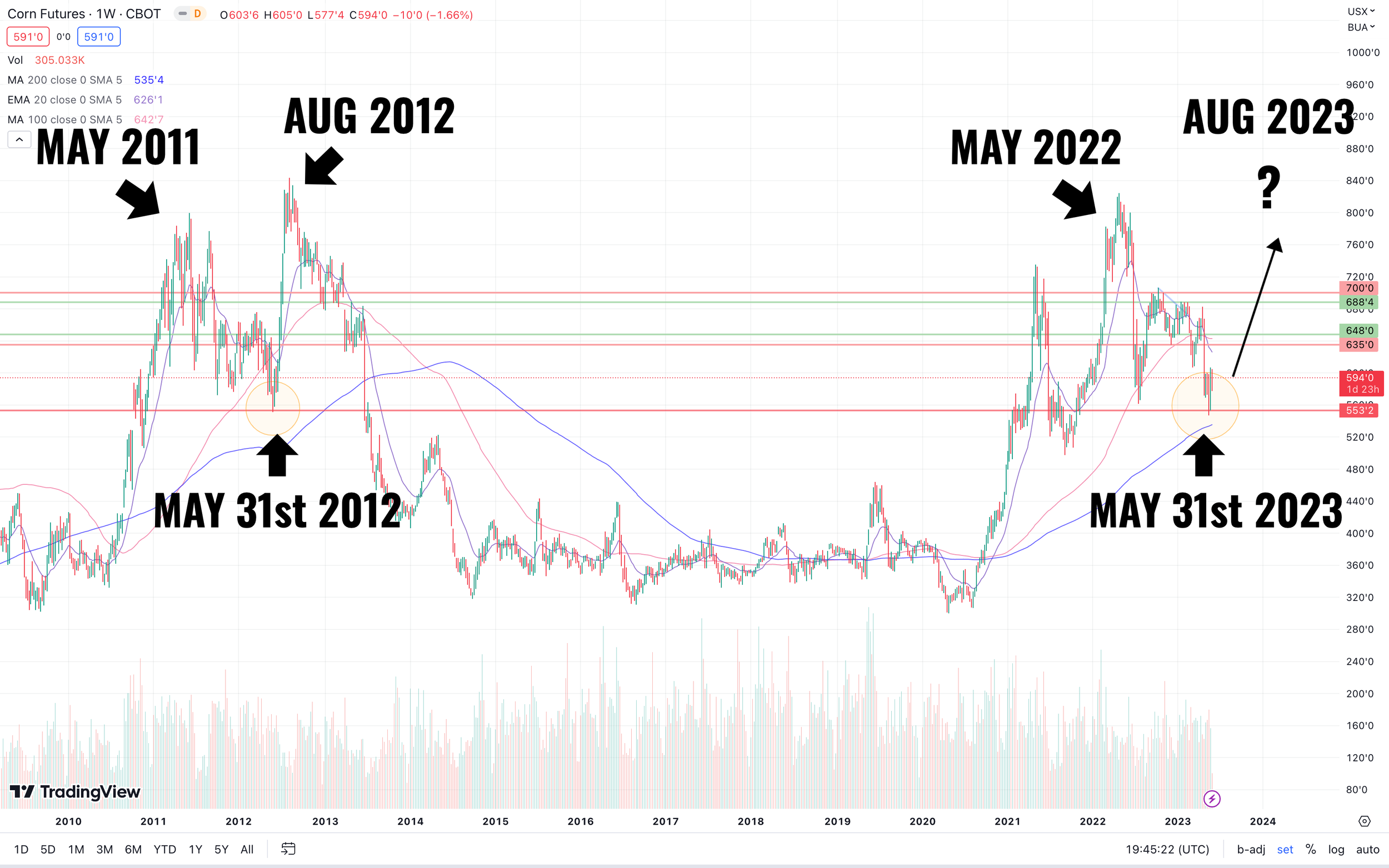 Another 2012 comparison. There is 23% more drought in 2023 for the Midwest than we had in 2012. The question is, does this dryness continue? If so, we could see corn a lot higher from here.