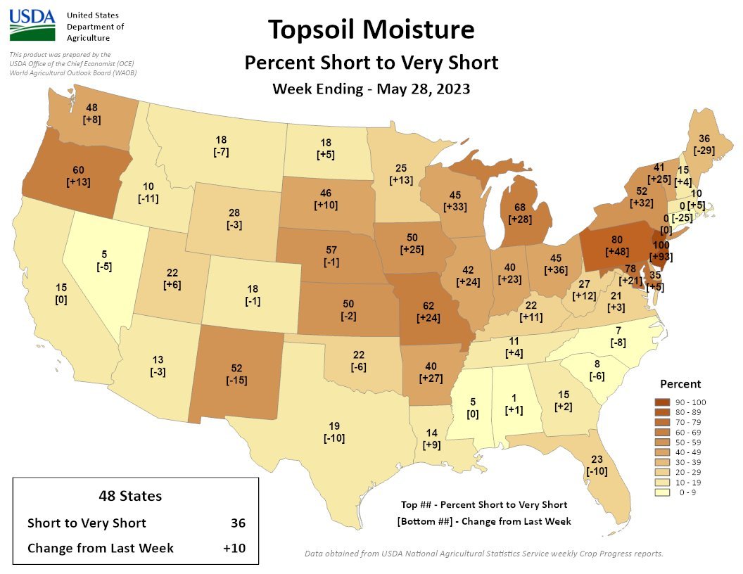 US soil moisture rated short to vey short also jumped 10% to 36% nationwide this week. As soil moisture drops rapidly in the midwest and north east.