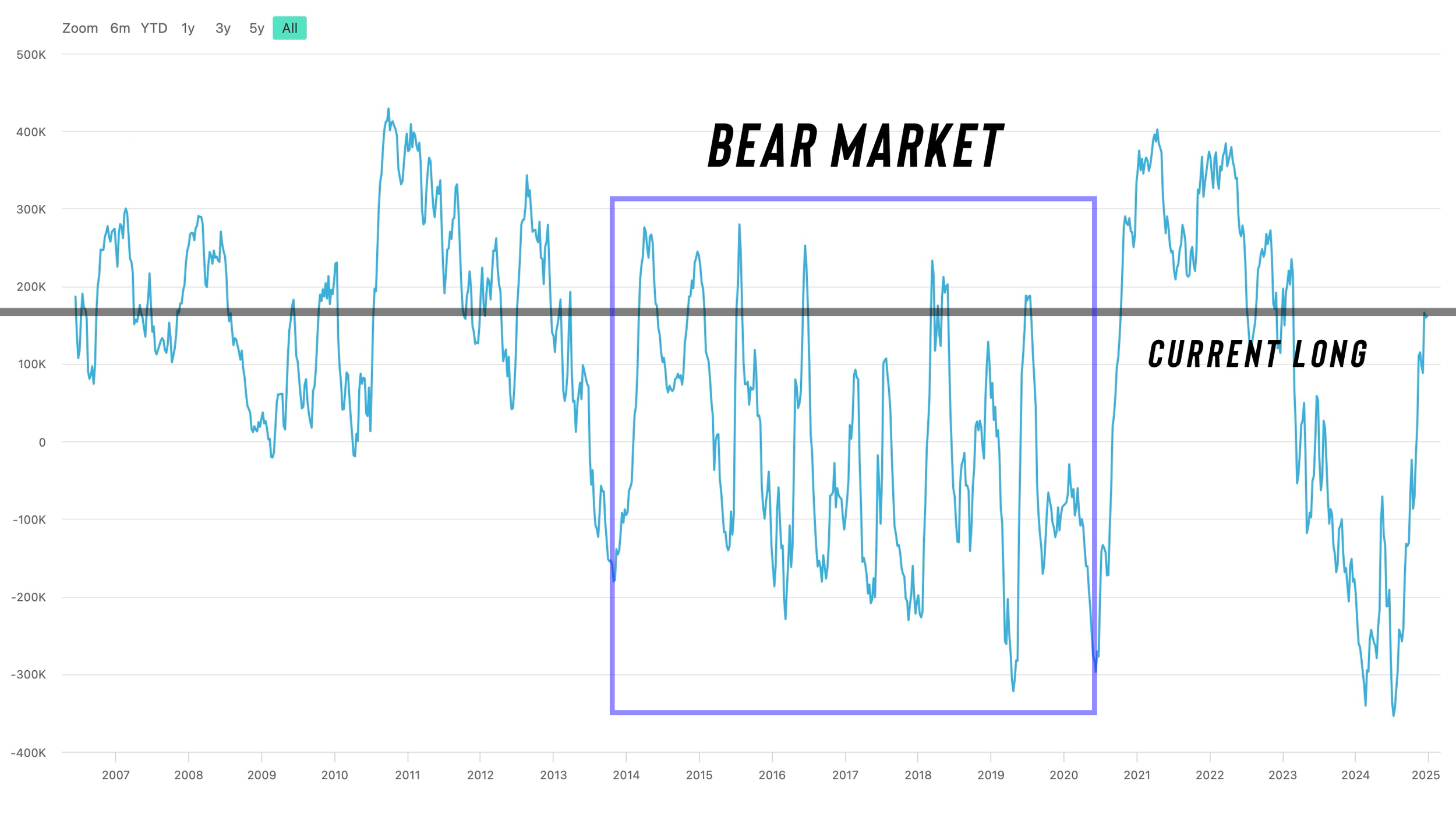 In other bear market years (2014-2019) the funds long position often peaked around 200k contracts.