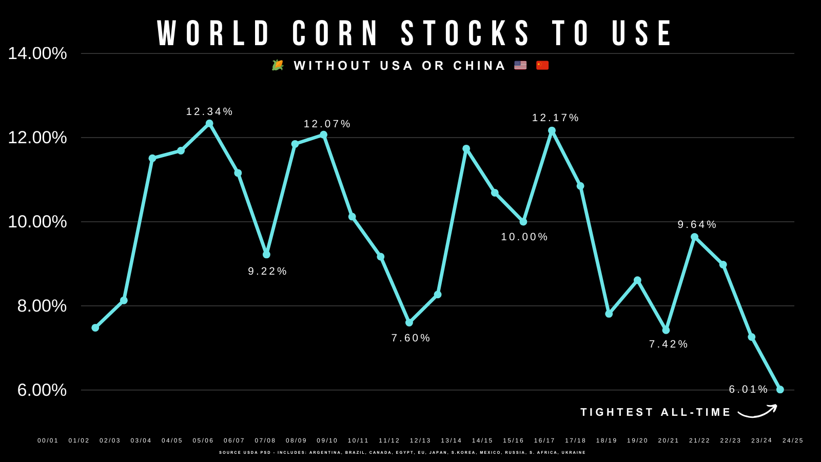 It simply means that outside these two, the rest of the world's corn supply is the lowest it has ever been relative to demand.