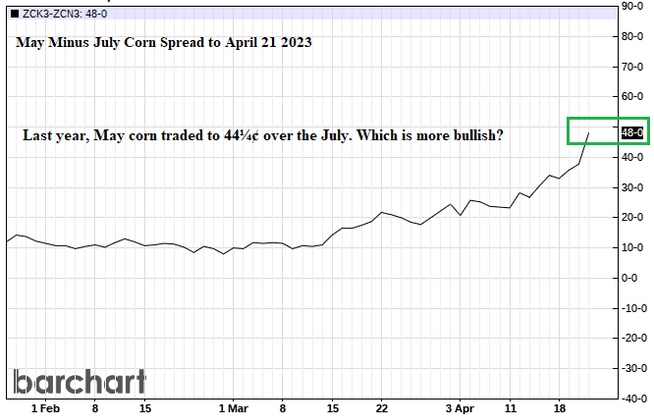 In 2022, May went 44¼¢ over the May on 3 March. May corn traded to $8.27 and July corn to $8.24 on April 29, 2022.
