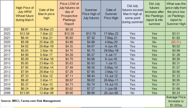 The seasonal rally tendency for new crop July KC HRW wheat futures is to rally thru the early part of the year and peak by summer/mid-June. The 15-year average price rally from the low of the USDA March intentions report day, to the summer high is $1.05/bu and works 14 out of 15 years. (Please see chart below)
