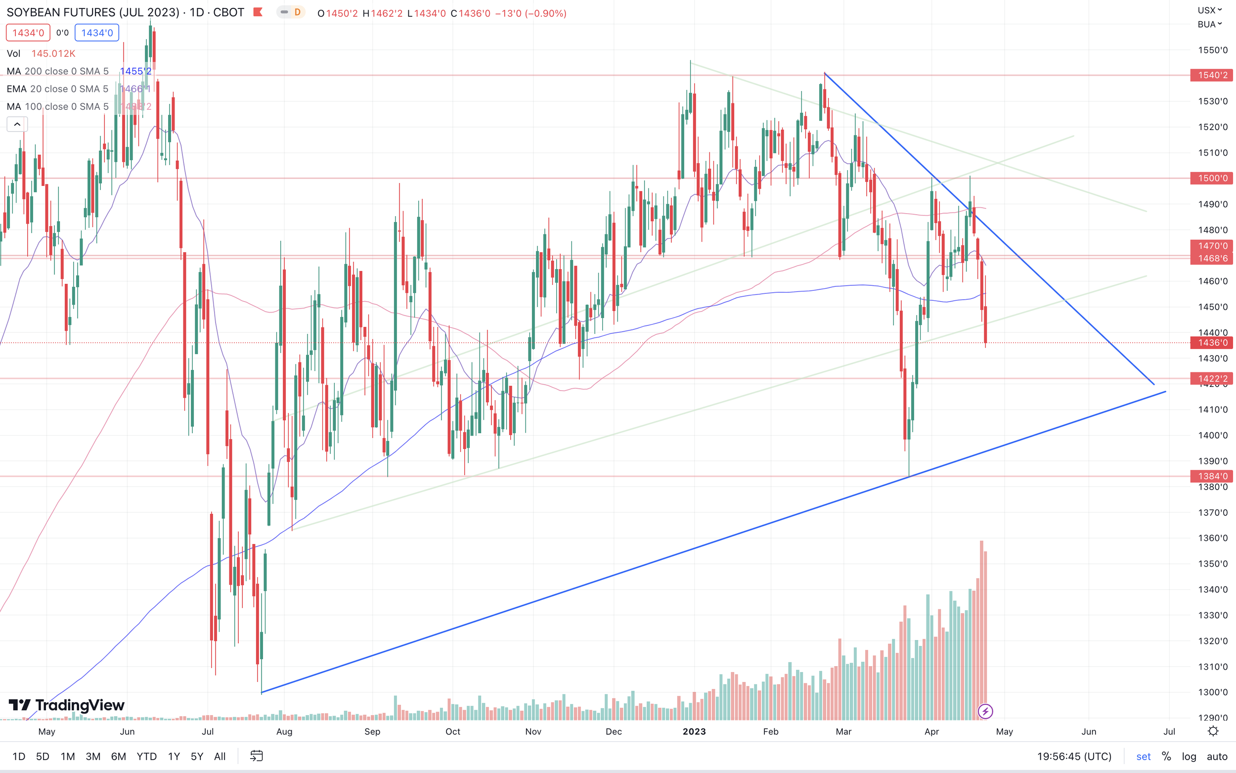 Taking a look at the chart, beans also broke a key support, as we broke that upward channel. We have some heavier support at the $14.22 level if we were to continue falling. But bulls would like a bounce and climb back into that channel.