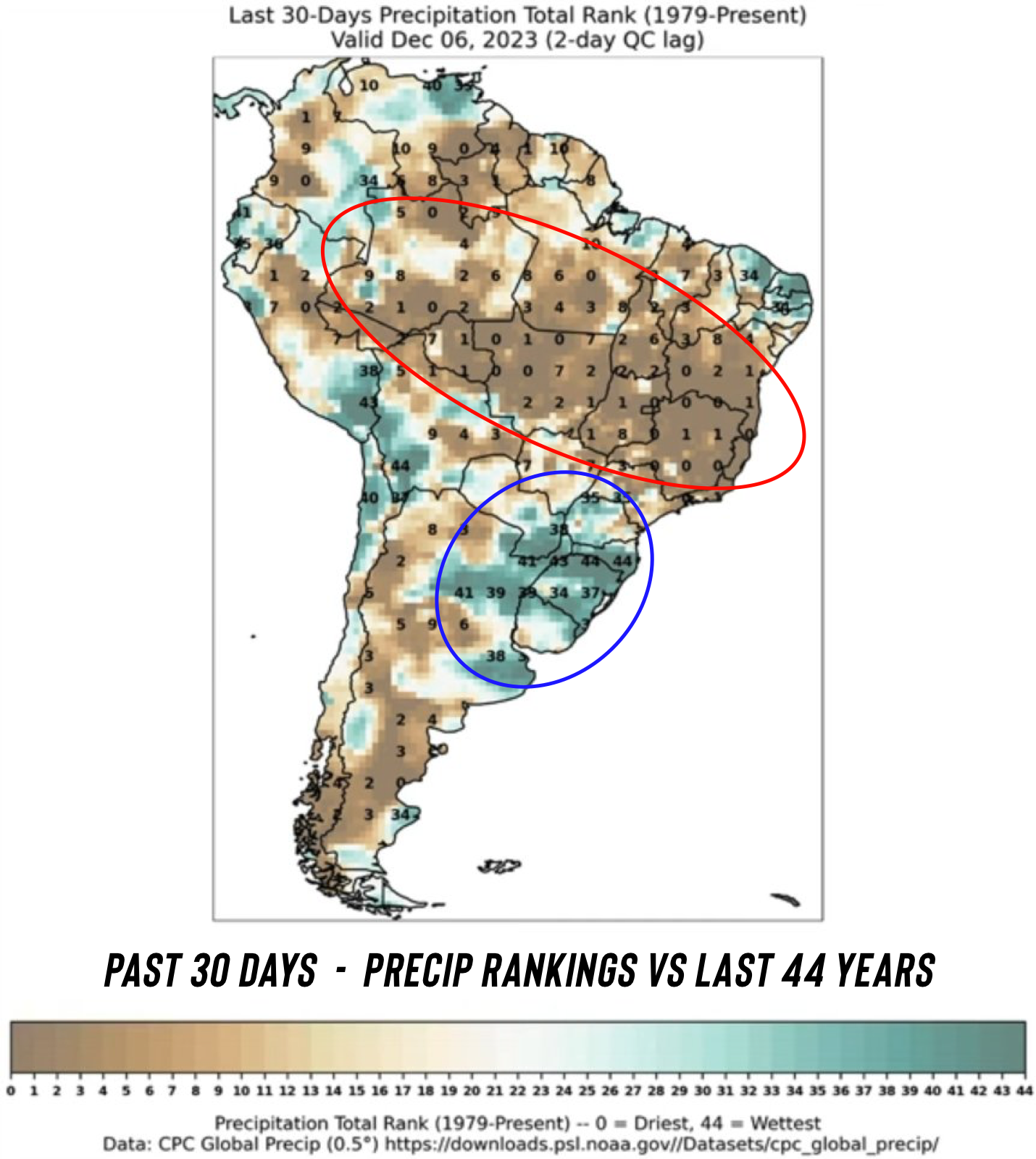 Here is the past 30 days of precipitation for Brazil compared to the last 44 years.