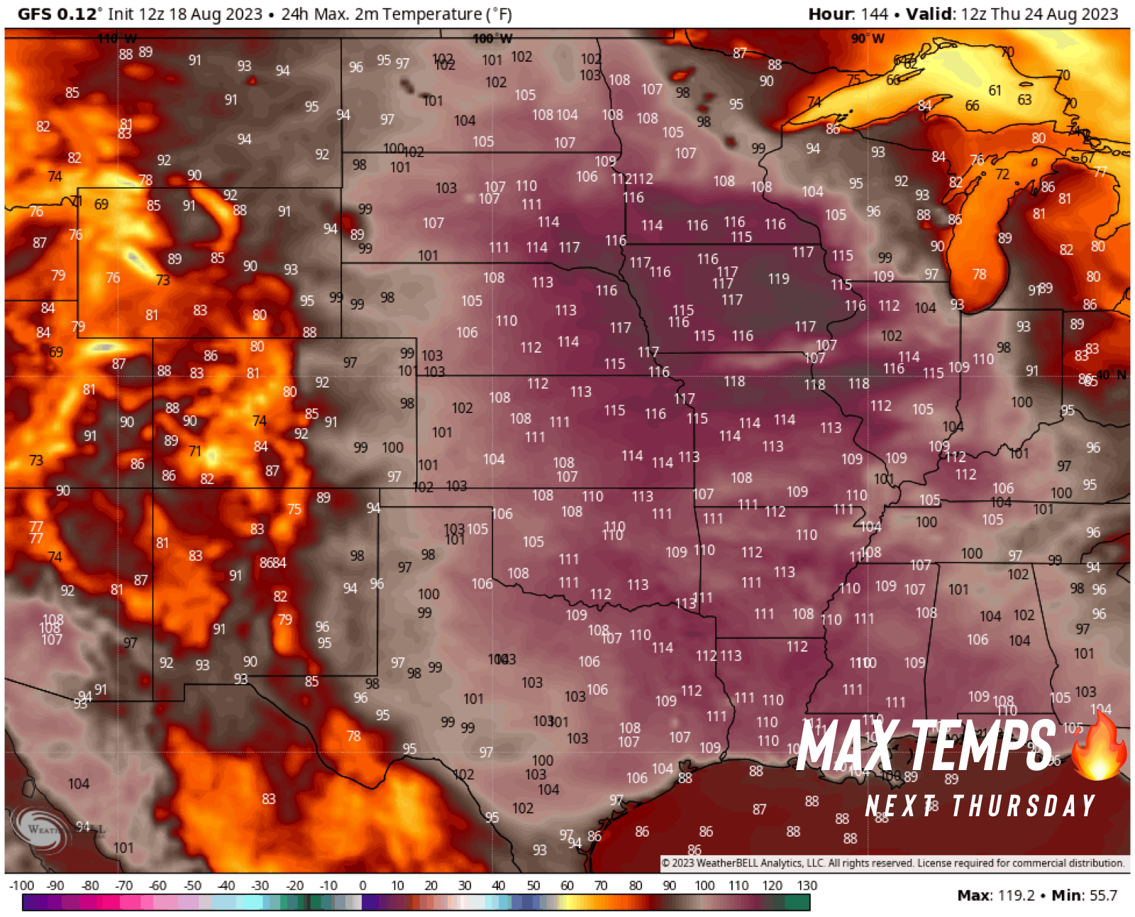 Here is the forecasts. The first one is the GFS model that shows the max temperatures for next Thursday. Now one thing to keep in mind is that often times this model can be off by 5 to 10 degrees. None the less, it’s extremely hot.