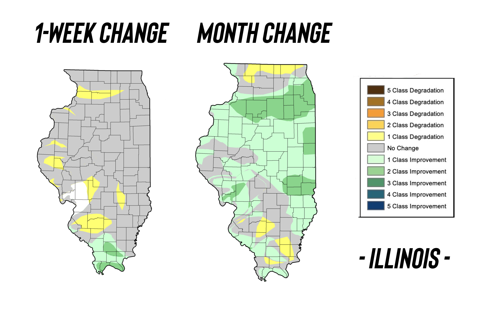 Here are a few states that have seen some notable changes. States such as Kansas, Ohio, and Indiana have improved. While the upper Midwest such as North Dakota and Minnestoa have continued to see more drought.