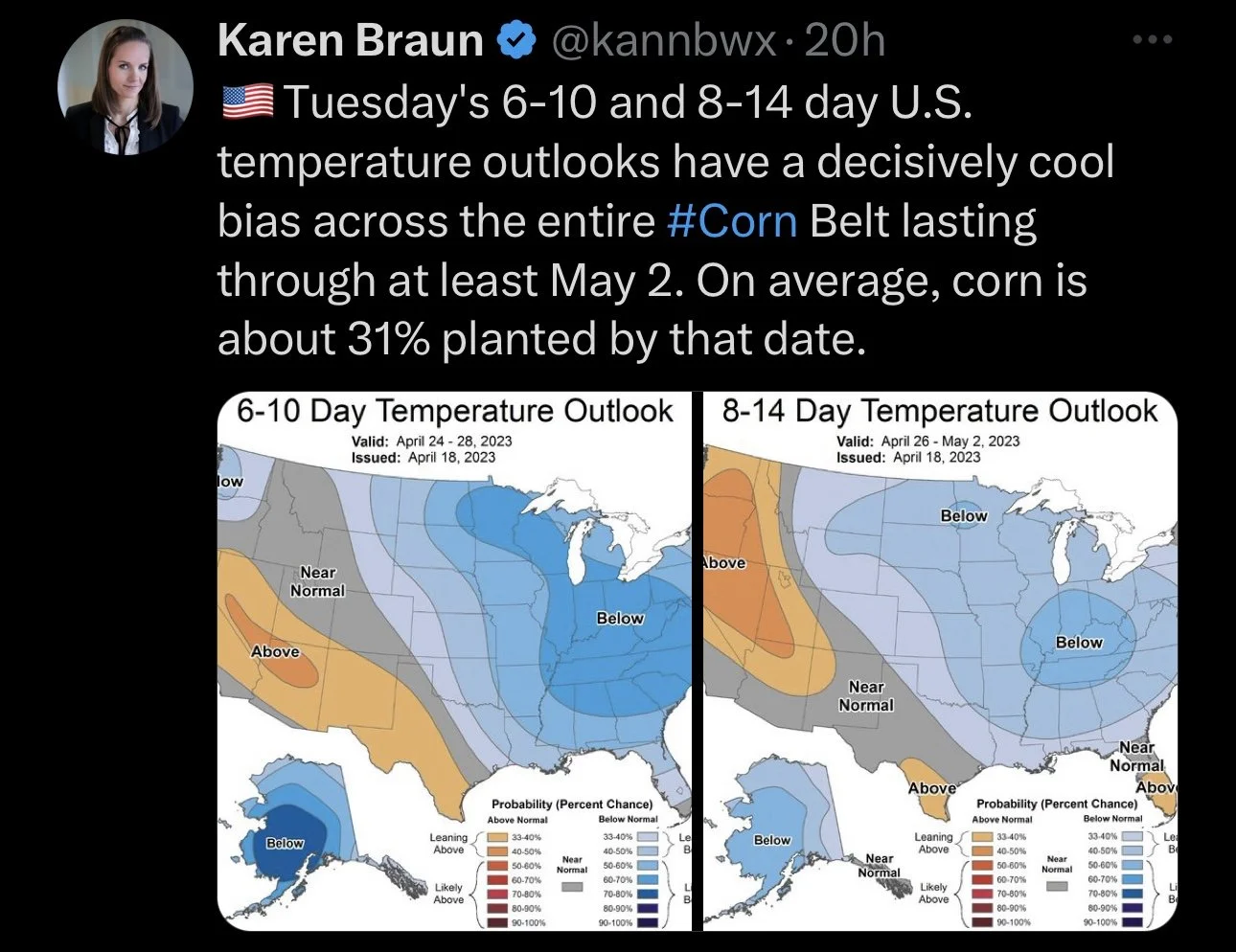 The main thing bulls are looking at is the forecasts. As they are showing cold weather and rain, which could slow down the fast start to planting we saw last week.