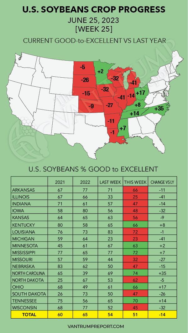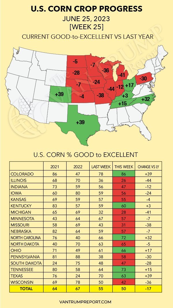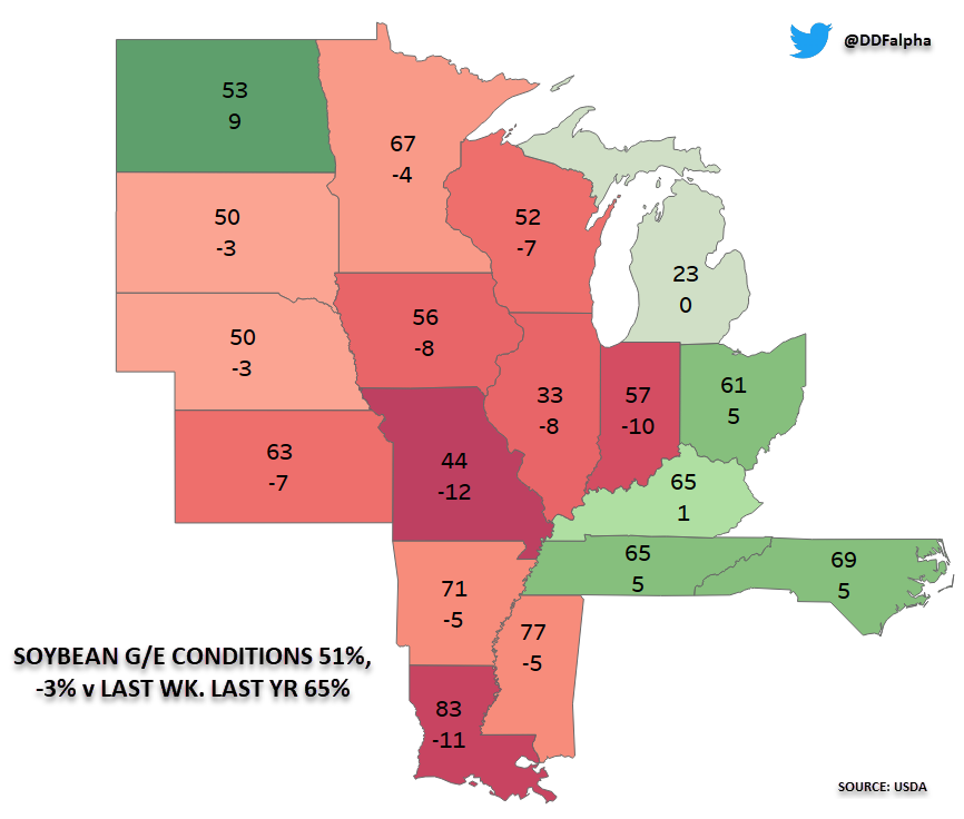 Illinois is that state that stands out. Sitting at just 25% rated good to excellent. A whopping -8% decrease from last week. Keep in mind, the top producing state started the year at 51%. Iowa is down to 48% from their initial 70% rated G/E. Ohio is the only state higher than initial numbers. Up 1% to 66%.