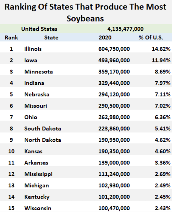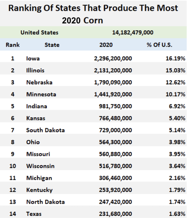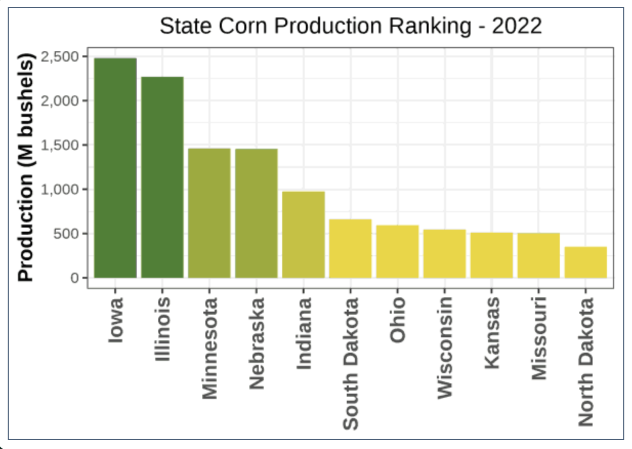 I included below a graphic from 2020 and 2022 that shows top state production. As you can see the top-5 corn-producing states rarely ever change their position, but depending on weather and variable circumstances the next several ranking states can often move around on the list from year-to-year.