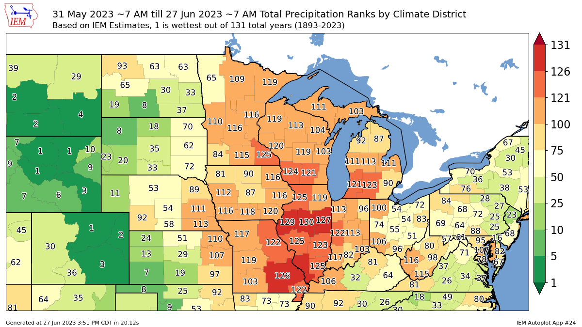 Here is a map that shows how this past 4 weeks have ranked up to the previous 131 years in terms of precipitation.