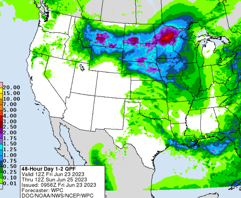 The biggest problem I have with the reason for today’s sell off was the fact that yes there is rain in the forecasts, but take a look at the areas expected to get rain. We have Minnesota, parts of Iowa, and the Dakotas. Rains in these areas won’t make the corn crop.