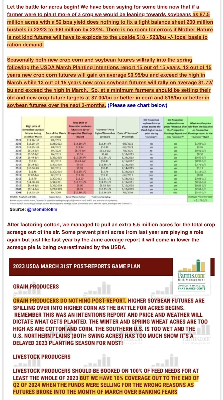 The focus will be on weather, first off will Mother Nature let us put anything in? Then shortly after it will become about how hot and dry areas are. If we see ridge building and get similarity to 2012 or even 1976 we will be off to the races. Whether the acre number ends up 95 or 85 million is very important but it will be a wide moving average with most thinking 90-92 is the present number. A 4-5 million acre shift is nearly the whole US carryout.